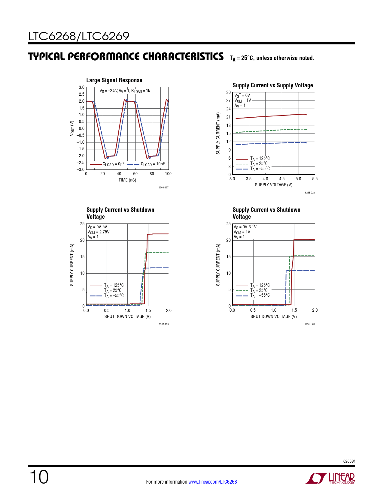 3.0 VS = ±2.5V, AV = 1, RLOAD = 1k 30 2.5 V – S = 0V 2.0 27 VCM = 1V A 1.5 24 V = 1 1.0 21 0.5 (V) 18 0.0 V OUT 15 –0.5 –1.0 Y CURRENT (mA) 12 –1.5 9 SUPPL –2.0 6 TA = 125°C –2.5 C T LOAD = 0pF CLOAD = 10pF 3 A = 25°C –3.0 TA = –55°C 0 20 40 60 80 100 0 TIME (nS) 3.0 3.5 4.0 4.5 5.0 5.5 SUPPLY VOLTAGE (V) 6268 G27 6268 G28