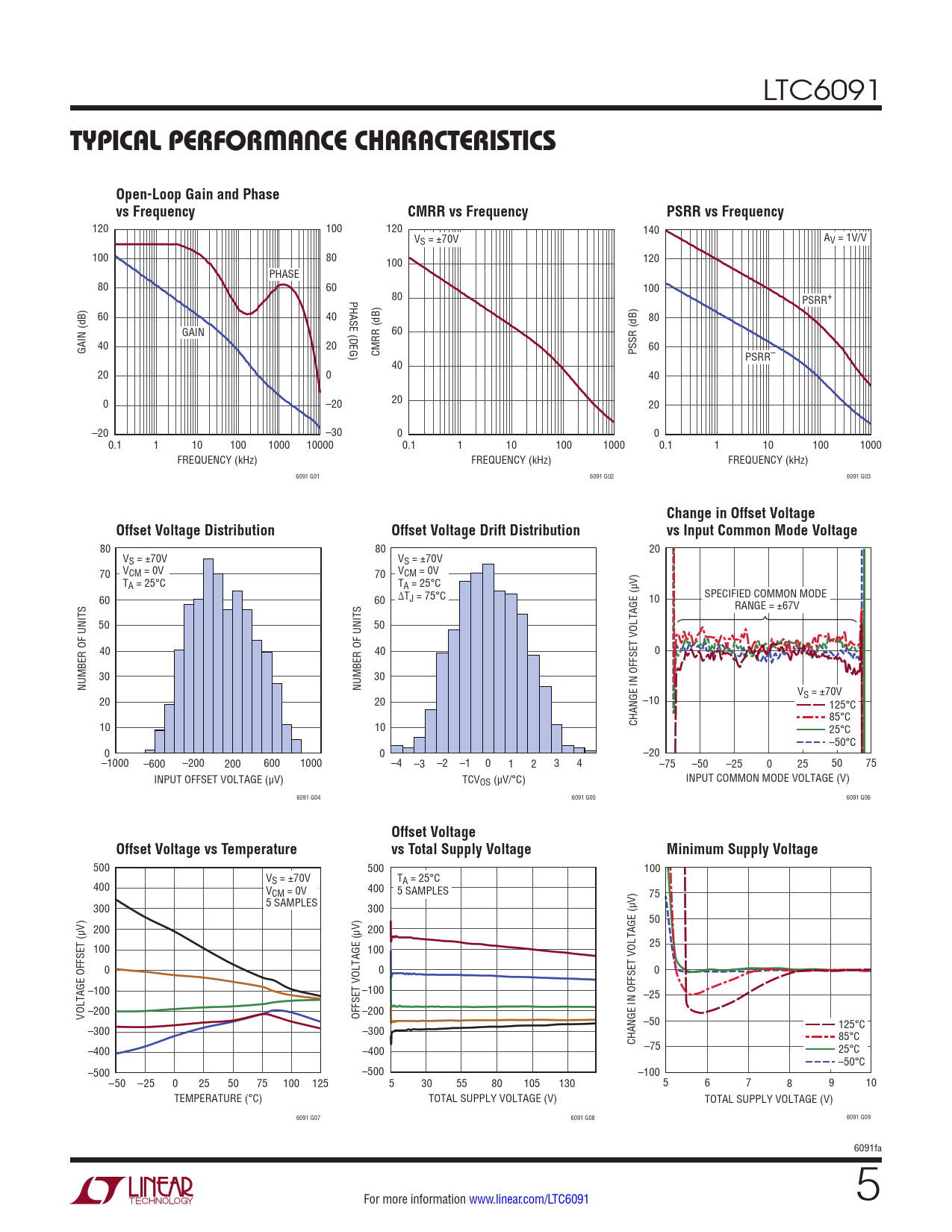 120 100 120 140 VS = ±70V AV = 1V/V 100 80 100 120 PHASE 80 60 100 PHASE (DEG) 80 PSRR+ 60 40 80 GAIN 60 40 GAIN (dB) 20 CMRR (dB) PSSR (dB) 60 PSRR– 40 20 0 40 0 –20 20 20 –20 –30 0 0 0.1 1 10 100 1000 10000 0.1 1 10 100 1000 0.1 1 10 100 1000 FREQUENCY (kHz) FREQUENCY (kHz) FREQUENCY (kHz) 6091 G01 6091 G02 6091 G03