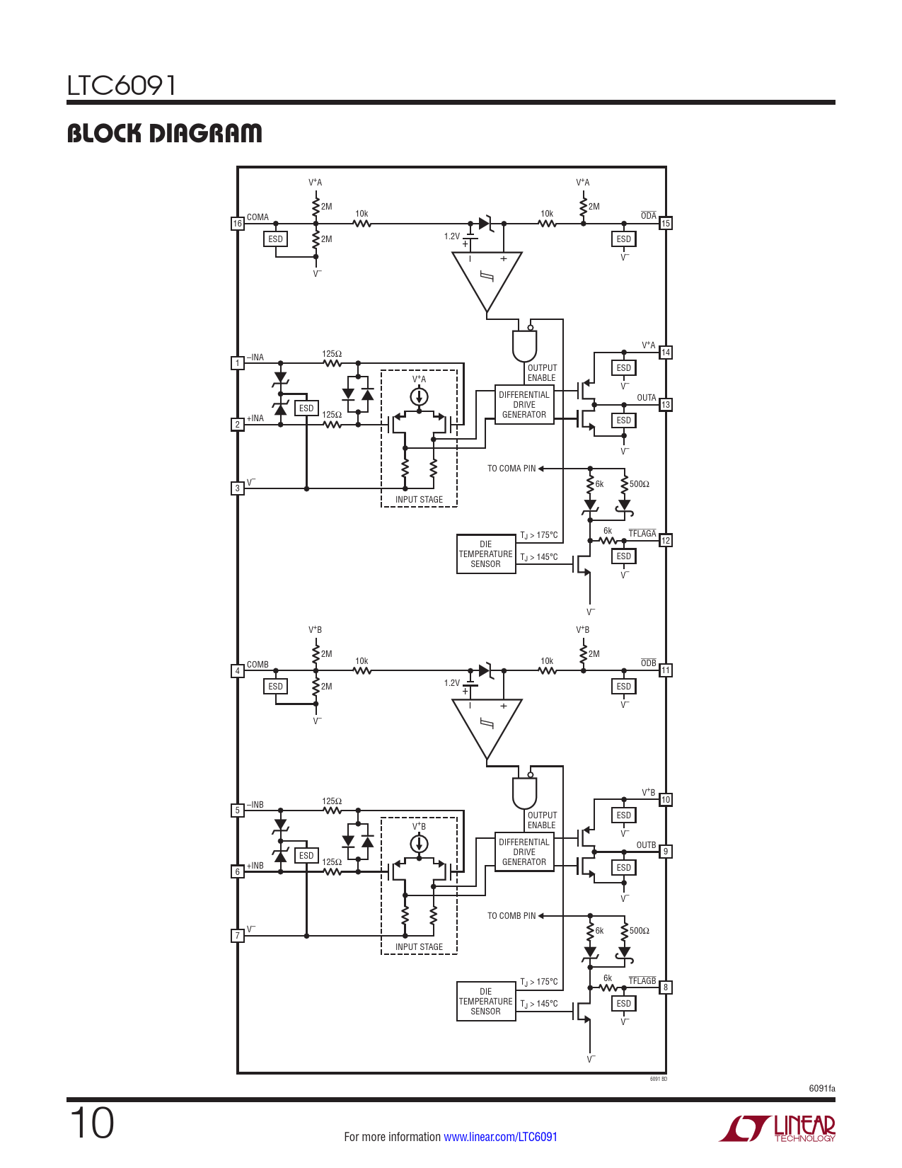 V+A V+A 2M 2M 10k 10k COMA ODA 16 15 1.2V ESD 2M + ESD – + V– V– V+A 125Ω 14 –INA 1 OUTPUT ESD V+A ENABLE V– DIFFERENTIAL OUTA ESD DRIVE 13 +INA 125Ω GENERATOR 2 ESD V– TO COMA PIN V– 3 6k 500Ω INPUT STAGE 6k TJ > 175°C TFLAGA DIE 12 TEMPERATURE TJ > 145°C ESD SENSOR V– V– V+B V+B 2M 2M 10k 10k COMB ODB 4 11 1.2V ESD 2M + ESD – + V– V– V+B 125Ω 10 –INB 5 OUTPUT ESD V+B ENABLE V– DIFFERENTIAL OUTB ESD DRIVE 9 +INB 125Ω GENERATOR 6 ESD V– TO COMB PIN V– 7 6k 500Ω INPUT STAGE 6k TJ > 175°C TFLAGB DIE 8 TEMPERATURE TJ > 145°C ESD SENSOR V– V– 6091 BD 6091fa 10 For more information www.linear.com/LTC6091 Document Outline Features Applications Description Typical Application Absolute Maximum Ratings Pin Configuration Order Information Electrical Characteristics Typical Performance Characteristics Pin Functions Block Diagram Applications Information Typical Applications Package Description Typical Application Related Parts