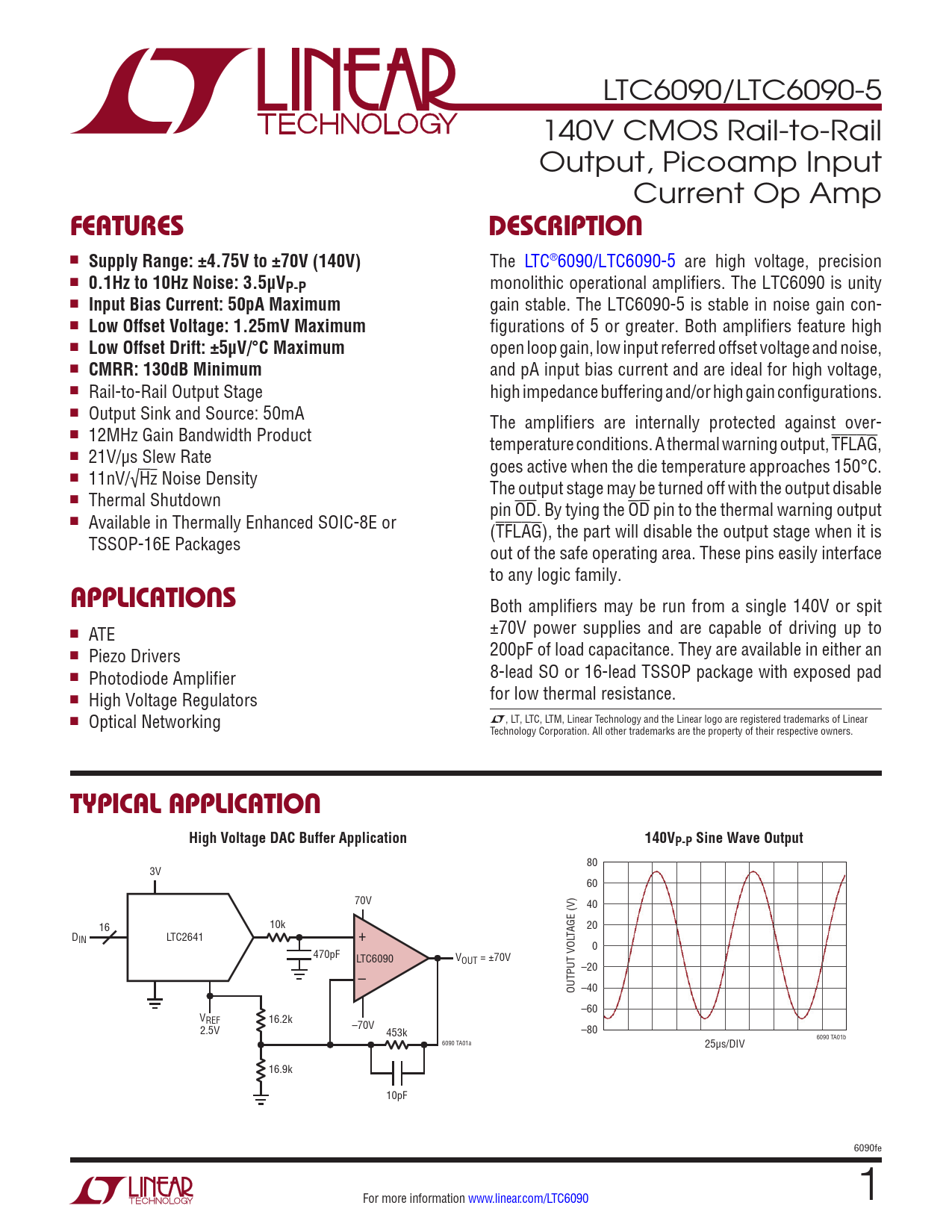 LTC6090/LTC6090-5 140V CMOS Rail-to-Rail Output, Picoamp Input Current Op Amp FEATURESDESCRIPTION n Supply Range: ±4.75V to ±70V (140V) The LTC®6090/LTC6090-5 are high voltage, precision n 0.1Hz to 10Hz Noise: 3.5μVP-P monolithic operational amplifiers. The LTC6090 is unity n Input Bias Current: 50pA Maximum gain stable. The LTC6090-5 is stable in noise gain con- n Low Offset Voltage: 1.25mV Maximum figurations of 5 or greater. Both amplifiers feature high n Low Offset Drift: ±5µV/°C Maximum open loop gain, low input referred offset voltage and noise, n CMRR: 130dB Minimum and pA input bias current and are ideal for high voltage, n Rail-to-Rail Output Stage high impedance buffering and/or high gain configurations. n Output Sink and Source: 50mA The amplifiers are internal y protected against over- n 12MHz Gain Bandwidth Product temperature conditions. A thermal warning output, TFLAG, n 21V/µs Slew Rate goes active when the die temperature approaches 150°C. n 11nV/√Hz Noise Density The output stage may be turned off with the output disable n Thermal Shutdown pin OD. By tying the OD pin to the thermal warning output n Available in Thermally Enhanced SOIC-8E or (TFLAG), the part will disable the output stage when it is TSSOP-16E Packages out of the safe operating area. These pins easily interface to any logic family. APPLICATIONS Both amplifiers may be run from a single 140V or spit n ±70V power supplies and are capable of driving up to ATE n 200pF of load capacitance. They are available in either an Piezo Drivers n 8-lead SO or 16-lead TSSOP package with exposed pad Photodiode Amplifier n for low thermal resistance. High Voltage Regulators n Optical Networking L, LT, LTC, LTM, Linear Technology and the Linear logo are registered trademarks of Linear Technology Corporation. All other trademarks are the property of their respective owners. TYPICAL APPLICATIONHigh Voltage DAC Buffer Application140VP-P Sine Wave Output 80 3V 60 70V 40 10k 16 20 D TAGE (V) IN LTC2641 + 0 470pF LTC6090 VOUT = ±70V –20 – OUTPUT VOL –40 –60 VREF 16.2k –70V 2.5V 453k –80 6090 TA01b 6090 TA01a 25µs/DIV 16.9k 10pF 6090fe For more information www.linear.com/LTC6090 1 Document Outline Features Applications Typical Application Description Absolute Maximum Ratings Pin Configuration Order Information Electrical Characteristics Typical Performance Characteristics Pin Functions Block Diagram Applications Information Typical Applications Package Description Revision History Typical Application Related Parts
