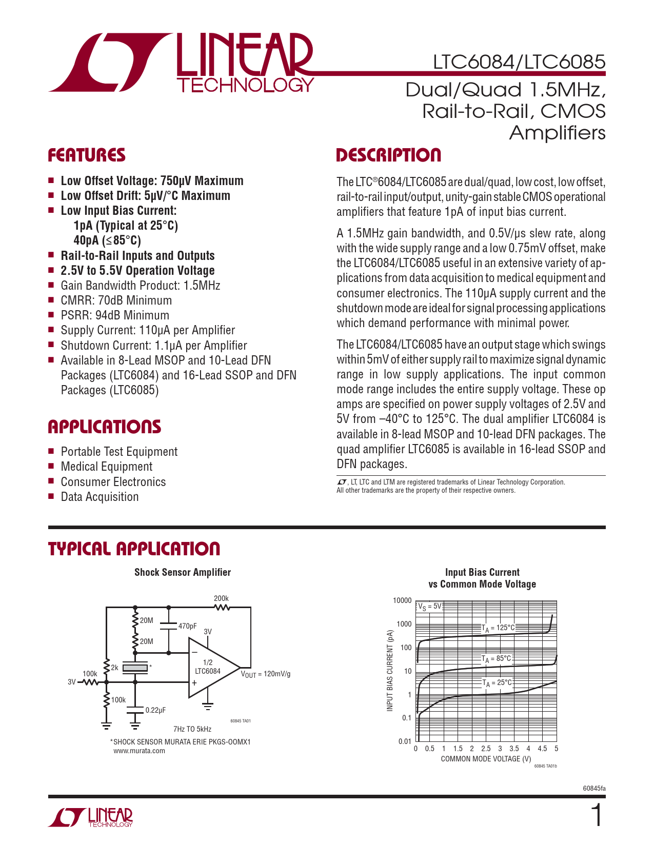 LTC6084/LTC6085 Dual/Quad 1.5MHz, Rail-to-Rail, CMOS Amplifi ers FEATURESDESCRIPTION n Low Offset Voltage: 750μV Maximum The LTC®6084/LTC6085 are dual/quad, low cost, low offset, n Low Offset Drift: 5μV/ ° C Maximum rail-to-rail input/output, unity-gain stable CMOS operational n Low Input Bias Current: amplifi ers that feature 1pA of input bias current. 1pA (Typical at 25 ° C) A 1.5MHz gain bandwidth, and 0.5V/μs slew rate, along 40pA(≤85 ° C) with the wide supply range and a low 0.75mV offset, make n Rail-to-Rail Inputs and Outputs the LTC6084/LTC6085 useful in an extensive variety of ap- n 2.5V to 5.5V Operation Voltage plications from data acquisition to medical equipment and n Gain Bandwidth Product: 1.5MHz consumer electronics. The 110μA supply current and the n CMRR: 70dB Minimum shutdown mode are ideal for signal processing applications n PSRR: 94dB Minimum which demand performance with minimal power. n Supply Current: 110μA per Amplifi er n Shutdown Current: 1.1μA per Amplifi er The LTC6084/LTC6085 have an output stage which swings n Available in 8-Lead MSOP and 10-Lead DFN within 5mV of either supply rail to maximize signal dynamic Packages (LTC6084) and 16-Lead SSOP and DFN range in low supply applications. The input common Packages (LTC6085) mode range includes the entire supply voltage. These op amps are specifi ed on power supply voltages of 2.5V and APPLICATIONS 5V from –40°C to 125°C. The dual amplifi er LTC6084 is available in 8-lead MSOP and 10-lead DFN packages. The n quad amplifi er LTC6085 is available in 16-lead SSOP and Portable Test Equipment n DFN packages. Medical Equipment n Consumer Electronics L, LT, LTC and LTM are registered trademarks of Linear Technology Corporation. n All other trademarks are the property of their respective owners. Data Acquisition TYPICAL APPLICATIONShock Sensor Amplifi erInput Bias Currentvs Common Mode Voltage 200k 10000 VS = 5V 20M 1000 470pF TA = 125°C 3V 20M 100 – TA T = 85°C A 1/2 2k * LTC6084 10 100k VOUT = 120mV/g 3V + TA = 25°C 1 100k 0.22μF INPUT BIAS CURRENT (pA) 0.1 60845 TA01 7Hz TO 5kHz *SHOCK SENSOR MURATA ERIE PKGS-OOMX1 0.01 0 0.5 1 1.5 2 2.5 3 3.5 4 4.5 5 www.murata.com COMMON MODE VOLTAGE (V) 60845 TA01b 60845fa 1