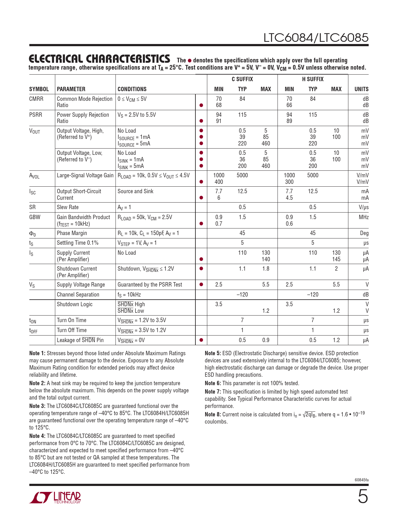 LTC6084/LTC6085 TheELECTRICAL CHARACTERISTICS l denotes the specifi cations which apply over the full operatingtemperature range, otherwise specifi cations are at TA = 25°C. Test conditions are V+ = 5V, V– = 0V, VCM = 0.5V unless otherwise noted.C SUFFIXH SUFFIXSYMBOLPARAMETERCONDITIONSMINTYPMAXMINTYPMAXUNITS CMRR Common Mode Rejection 0 ≤ VCM ≤ 5V 70 84 70 84 dB Ratio l 68 66 dB PSRR Power Supply Rejection VS = 2.5V to 5.5V 94 115 94 115 dB Ratio l 91 89 dB VOUT Output Voltage, High, No Load l 0.5 5 0.5 10 mV (Referred to V+) ISOURCE = 1mA l 39 85 39 100 mV ISOURCE = 5mA l 220 460 220 mV Output Voltage, Low, No Load l 0.5 5 0.5 10 mV (Referred to V–) ISINK = 1mA l 36 85 36 100 mV ISINK = 5mA l 200 460 200 mV AVOL Large-Signal Voltage Gain RLOAD = 10k, 0.5V ≤ VOUT ≤ 4.5V 1000 5000 1000 5000 V/mV l 400 300 V/mV ISC Output Short-Circuit Source and Sink 7.7 12.5 7.7 12.5 mA Current l 6 4.5 mA SR Slew Rate AV = 1 0.5 0.5 V/μs GBW Gain Bandwidth Product RLOAD = 50k, VCM = 2.5V 0.9 1.5 0.9 1.5 MHz (fTEST = 10kHz) l 0.7 0.6 Φ0 Phase Margin RL = 10k, CL = 150pF, AV = 1 45 45 Deg tS Settling Time 0.1% VSTEP = 1V, AV = 1 5 5 μs IS Supply Current No Load 110 130 110 130 μA (Per Amplifi er) l 140 145 μA Shutdown Current Shutdown, VSHDNx ≤ 1.2V l 1.1 1.8 1.1 2 μA (Per Amplifi er) VS Supply Voltage Range Guaranteed by the PSRR Test l 2.5 5.5 2.5 5.5 V Channel Separation fS = 10kHz –120 –120 dB Shutdown Logic SHDNx High 3.5 3.5 V SHDNx Low 1.2 1.2 V tON Turn On Time VSHDNx = 1.2V to 3.5V 7 7 μs tOFF Turn Off Time VSHDNx = 3.5V to 1.2V 1 1 μs Leakage of SHDN Pin VSHDNx = 0V l 0.5 0.9 0.5 1.2 μA Note 1: Stresses beyond those listed under Absolute Maximum Ratings Note 5: ESD (Electrostatic Discharge) sensitive device. ESD protection may cause permanent damage to the device. Exposure to any Absolute devices are used extensively internal to the LTC6084/LTC6085; however, Maximum Rating condition for extended periods may affect device high electrostatic discharge can damage or degrade the device. Use proper reliability and lifetime. ESD handling precautions. Note 2: A heat sink may be required to keep the junction temperature Note 6: This parameter is not 100% tested. below the absolute maximum. This depends on the power supply voltage Note 7: This specifi cation is limited by high speed automated test and the total output current. capability. See Typical Performance Characteristic curves for actual Note 3: The LTC6084C/LTC6085C are guaranteed functional over the performance. operating temperature range of –40°C to 85°C. The LTC6084H/LTC6085H Note 8: Current noise is calculated from in = √2qIB, where q = 1.6 • 10–19 are guaranteed functional over the operating temperature range of –40°C coulombs. to 125°C. Note 4: The LTC6084C/LTC6085C are guaranteed to meet specifi ed performance from 0°C to 70°C. The LTC6084C/LTC6085C are designed, characterized and expected to meet specifi ed performance from –40°C to 85°C but are not tested or QA sampled at these temperatures. The LTC6084H/LTC6085H are guaranteed to meet specifi ed performance from –40°C to 125°C. 60845fa 5