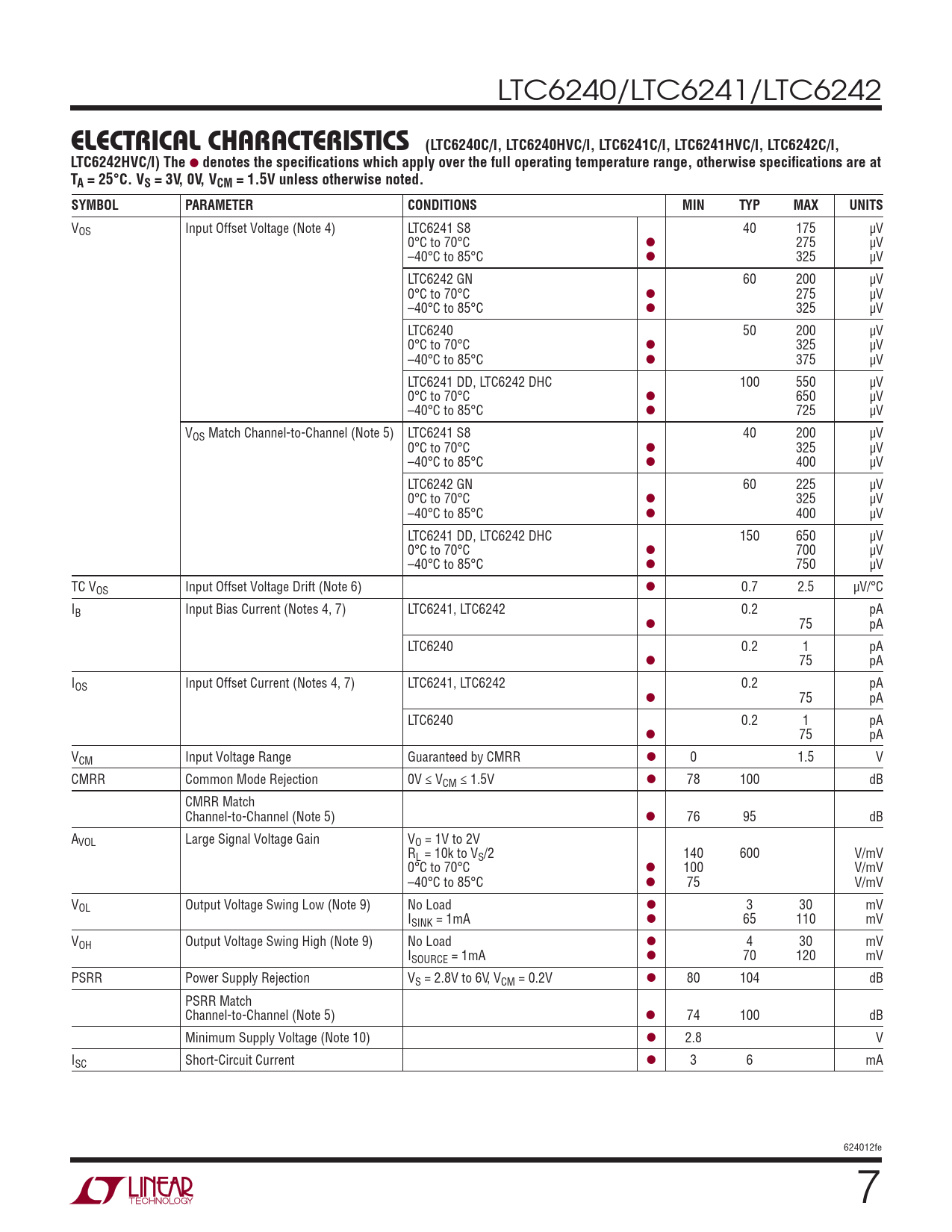 Pages / Page32 / 7 — ELECTRICAL CHARACTERISTICS. (LTC6240C/I, LTC6240HVC/I, LTC6241C/I, …