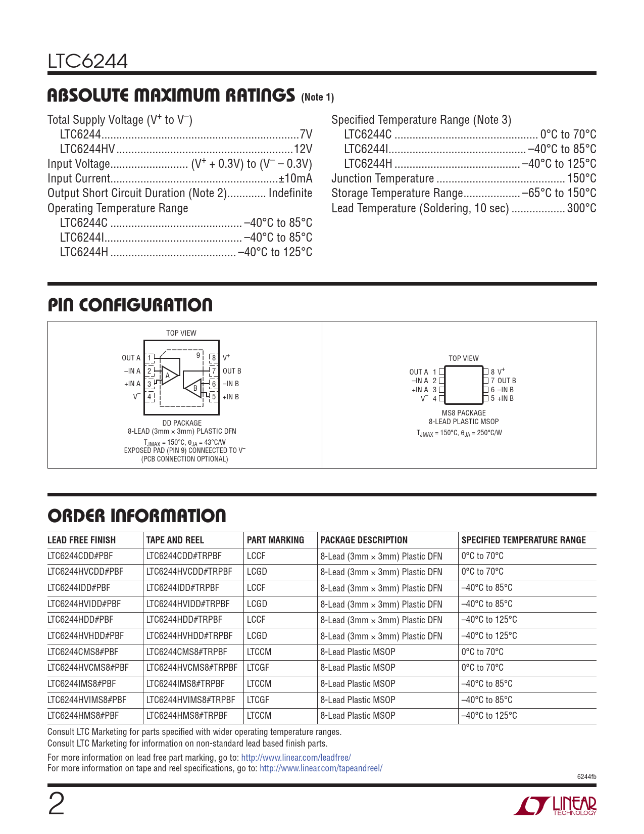 LTC6244CDD#PBF LTC6244CDD#TRPBF LCCF 8-Lead (3mm × 3mm) Plastic DFN 0°C to 70°C LTC6244HVCDD#PBF LTC6244HVCDD#TRPBF LCGD 8-Lead (3mm × 3mm) Plastic DFN 0°C to 70°C LTC6244IDD#PBF LTC6244IDD#TRPBF LCCF 8-Lead (3mm × 3mm) Plastic DFN –40°C to 85°C LTC6244HVIDD#PBF LTC6244HVIDD#TRPBF LCGD 8-Lead (3mm × 3mm) Plastic DFN –40°C to 85°C LTC6244HDD#PBF LTC6244HDD#TRPBF LCCF 8-Lead (3mm × 3mm) Plastic DFN –40°C to 125°C LTC6244HVHDD#PBF LTC6244HVHDD#TRPBF LCGD 8-Lead (3mm × 3mm) Plastic DFN –40°C to 125°C LTC6244CMS8#PBF LTC6244CMS8#TRPBF LTCCM 8-Lead Plastic MSOP 0°C to 70°C LTC6244HVCMS8#PBF LTC6244HVCMS8#TRPBF LTCGF 8-Lead Plastic MSOP 0°C to 70°C LTC6244IMS8#PBF LTC6244IMS8#TRPBF LTCCM 8-Lead Plastic MSOP –40°C to 85°C LTC6244HVIMS8#PBF LTC6244HVIMS8#TRPBF LTCGF 8-Lead Plastic MSOP –40°C to 85°C LTC6244HMS8#PBF LTC6244HMS8#TRPBF LTCCM 8-Lead Plastic MSOP –40°C to 125°C Consult LTC Marketing for parts specifi ed with wider operating temperature ranges. Consult LTC Marketing for information on non-standard lead based fi nish parts. For more information on lead free part marking, go to: http://www.linear.com/leadfree/ For more information on tape and reel specifi cations, go to: http://www.linear.com/tapeandreel/ 6244fb 2