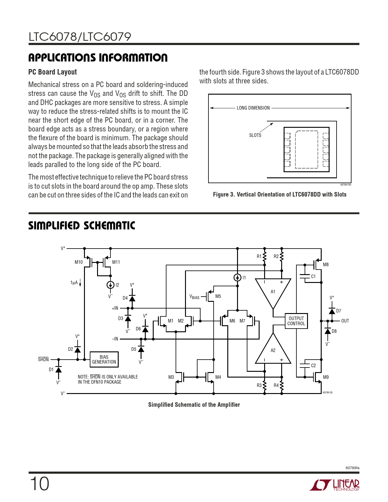 LTC6078/LTC6079 UUWUAPPLICATIO S I FOR ATIOPC Board Layout the fourth side. Figure 3 shows the layout of a LTC6078DD with slots at three sides. Mechanical stress on a PC board and soldering-induced stress can cause the VOS and VOS drift to shift. The DD and DHC packages are more sensitive to stress. A simple way to reduce the stress-related shifts is to mount the IC LONG DIMENSION near the short edge of the PC board, or in a corner. The board edge acts as a stress boundary, or a region where the fl exure of the board is minimum. The package should SLOTS always be mounted so that the leads absorb the stress and not the package. The package is generally aligned with the leads paralled to the long side of the PC board. The most effective technique to relieve the PC board stress is to cut slots in the board around the op amp. These slots 60789 F03 can be cut on three sides of the IC and the leads can exit on Figure 3. Vertical Orientation of LTC6078DD with SlotsWWSI PLIFIED SCHE ATIC V+ R1 R2 M10 M11 M8 I1 – + C1 1µA I2 V+ A1 V– V M5 BIAS D4 V+ +IN D7 V+ D3 OUTPUT M1 M2 M6 M7 OUT CONTROL D6 V– D8 V+ –IN V– D2 D5 A2 BIAS SHDN – + GENERATION V– C2 D1 NOTE: SHDN IS ONLY AVAILABLE M3 M4 M9 V– IN THE DFN10 PACKAGE R3 R4 60789 SS V– Simplifi ed Schematic of the Amplifi er 60789fa 10