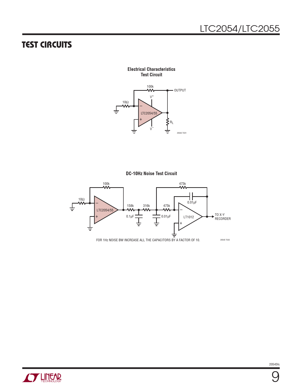 100k 475k 10Ω – 0.01μF 158k 316k 475k LTC2054/55 – + 0.1μF 0.01μF TO X-Y LT1012 RECORDER + 20545 TC02 FOR 1Hz NOISE BW INCREASE ALL THE CAPACITORS BY A FACTOR OF 10. 20545fc 9