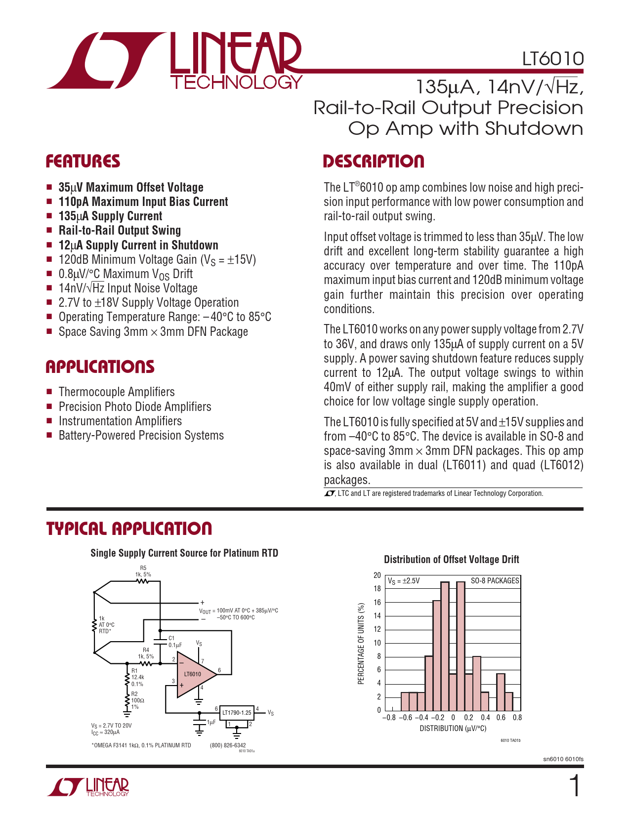 LT6010 135µA, 14nV/√Hz, Rail-to-Rail Output Precision Op Amp with Shutdown UFEATURESDESCRIPTIO ■ 35 µ V Maximum Offset Voltage The LT®6010 op amp combines low noise and high preci- ■ 110pA Maximum Input Bias Current sion input performance with low power consumption and ■ 135 µ A Supply Current rail-to-rail output swing. ■ Rail-to-Rail Output Swing Input offset voltage is trimmed to less than 35µV. The low ■ 12 µ A Supply Current in Shutdown drift and excellent long-term stability guarantee a high ■ 120dB Minimum Voltage Gain (VS = ±15V) accuracy over temperature and over time. The 110pA ■ 0.8µV/°C Maximum VOS Drift maximum input bias current and 120dB minimum voltage ■ 14nV/√Hz Input Noise Voltage gain further maintain this precision over operating ■ 2.7V to ±18V Supply Voltage Operation conditions. ■ Operating Temperature Range: – 40°C to 85°C ■ Space Saving 3mm × 3mm DFN Package The LT6010 works on any power supply voltage from 2.7V to 36V, and draws only 135µA of supply current on a 5V U supply. A power saving shutdown feature reduces supply APPLICATIO S current to 12µA. The output voltage swings to within 40mV of either supply rail, making the amplifier a good ■ Thermocouple Amplifiers choice for low voltage single supply operation. ■ Precision Photo Diode Amplifiers ■ Instrumentation Amplifiers The LT6010 is fully specified at 5V and ±15V supplies and ■ Battery-Powered Precision Systems from –40°C to 85°C. The device is available in SO-8 and space-saving 3mm × 3mm DFN packages. This op amp is also available in dual (LT6011) and quad (LT6012) packages. , LTC and LT are registered trademarks of Linear Technology Corporation. UTYPICAL APPLICATIOSingle Supply Current Source for Platinum RTDDistribution of Offset Voltage Drift R5 1k, 5% 20 VS = ±2.5V SO-8 PACKAGES 18 + 16 VOUT = 100mV AT 0°C + 385µV/°C 1k –50°C TO 600°C – 14 AT 0°C RTD* 12 C1 V 0.1 S µF 10 R4 1k, 5% 8 2 – 7 R1 6 6 LT6010 12.4k 3 + 0.1% PERCENTAGE OF UNITS (%) 4 4 R2 2 100Ω 1% 6 4 LT1790-1.25 V 0 S –0.8 –0.6 –0.4 –0.2 0 0.2 0.4 0.6 0.8 1µF V 1 2 S = 2.7V TO 20V DISTRIBUTION (µV/°C) ICC ≈ 320µA 6010 TA01b *OMEGA F3141 1kΩ, 0.1% PLATINUM RTD (800) 826-6342 6010 TA01a sn6010 6010fs 1