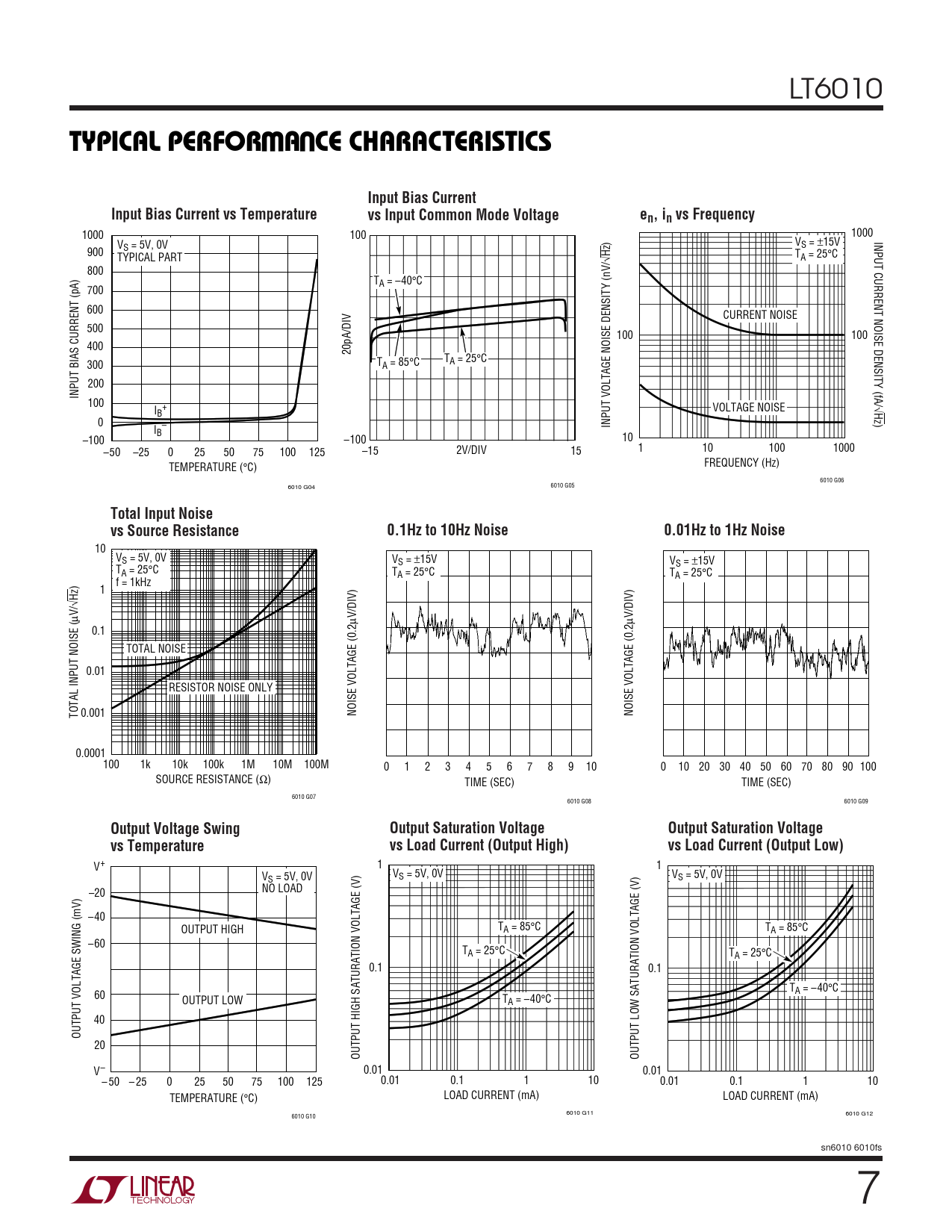 V+ 1 1 V V V S = 5V, 0V S = 5V, 0V S = 5V, 0V –20 NO LOAD –40 OUTPUT HIGH TA = 85°C TA = 85°C –60 TA = 25°C TA = 25°C 0.1 0.1 T 60 A = –40°C OUTPUT LOW TA = –40°C 40 OUTPUT VOLTAGE SWING (mV) 20 OUTPUT HIGH SATURATION VOLTAGE (V) OUTPUT LOW SATURATION VOLTAGE (V) V– 0.01 0.01 – 50 – 25 0 25 50 75 100 125 0.01 0.1 1 10 0.01 0.1 1 10 TEMPERATURE (°C) LOAD CURRENT (mA) LOAD CURRENT (mA) 6010 G11 6010 G12 6010 G10 sn6010 6010fs 7