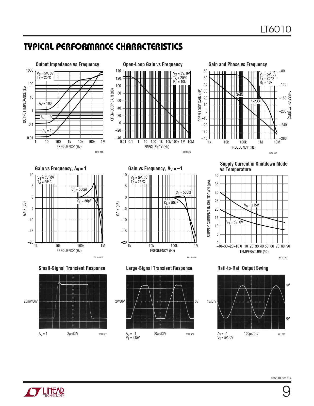 5V 20mV/DIV 2V/DIV 0V 1V/DIV 0V AV = 1 2µs/DIV 6011 G27 AV = –1 50µs/DIV 6011 G28 AV = –1 100µs/DIV 6011 G29 VS = ±15V VS = 5V, 0V sn6010 6010fs 9