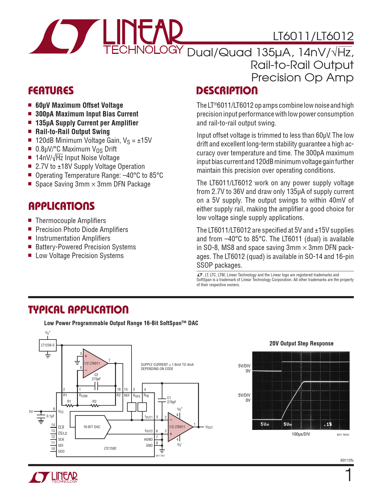 LT6011/LT6012 Dual/Quad 135µA, 14nV/√Hz, Rail-to-Rail Output Precision Op Amp