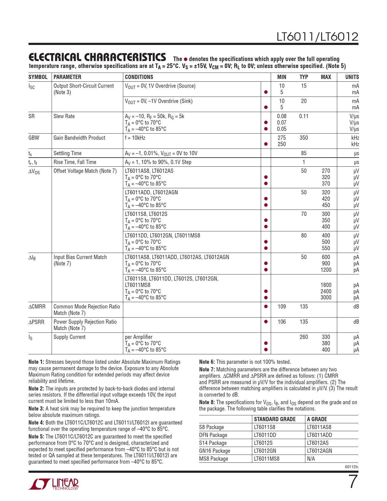 ISC Output Short-Circuit Current VOUT = 0V, 1V Overdrive (Source) 10 15 mA (Note 3) l 5 mA VOUT = 0V, –1V Overdrive (Sink) 10 20 mA l 5 mA SR Slew Rate AV = –10, RF = 50k, RG = 5k 0.08 0.11 V/µs TA = 0°C to 70°C l 0.07 V/µs TA = –40°C to 85°C l 0.05 V/µs GBW Gain Bandwidth Product f = 10kHz 275 350 kHz l 250 kHz ts Settling Time AV = –1, 0.01%, VOUT = 0V to 10V 85 µs tr , tf Rise Time, Fall Time AV = 1, 10% to 90%, 0.1V Step 1 µs ∆VOS Offset Voltage Match (Note 7) LT6011AS8, LT6012AS 50 270 µV TA = 0°C to 70°C l 320 µV TA = –40°C to 85°C l 370 µV LT6011ADD, LT6012AGN 50 320 µV TA = 0°C to 70°C l 420 µV TA = –40°C to 85°C l 450 µV LT6011S8, LT6012S 70 300 µV TA = 0°C to 70°C l 350 µV TA = –40°C to 85°C l 400 µV LT6011DD, LT6012GN, LT6011MS8 80 400 µV TA = 0°C to 70°C l 500 µV TA = –40°C to 85°C l 550 µV ∆IB Input Bias Current Match LT6011AS8, LT6011ADD, LT6012AS, LT6012AGN 50 600 pA (Note 7) TA = 0°C to 70°C l 900 pA TA = –40°C to 85°C l 1200 pA LT6011S8, LT6011DD, LT6012S, LT6012GN, LT6011MS8 1800 pA TA = 0°C to 70°C l 2400 pA TA = –40°C to 85°C l 3000 pA ∆CMRR Common Mode Rejection Ratio l 109 135 dB Match (Note 7) ∆PSRR Power Supply Rejection Ratio l 106 135 dB Match (Note 7) IS Supply Current per Amplifier 260 330 µA TA = 0°C to 70°C l 380 µA TA = –40°C to 85°C l 400 µA