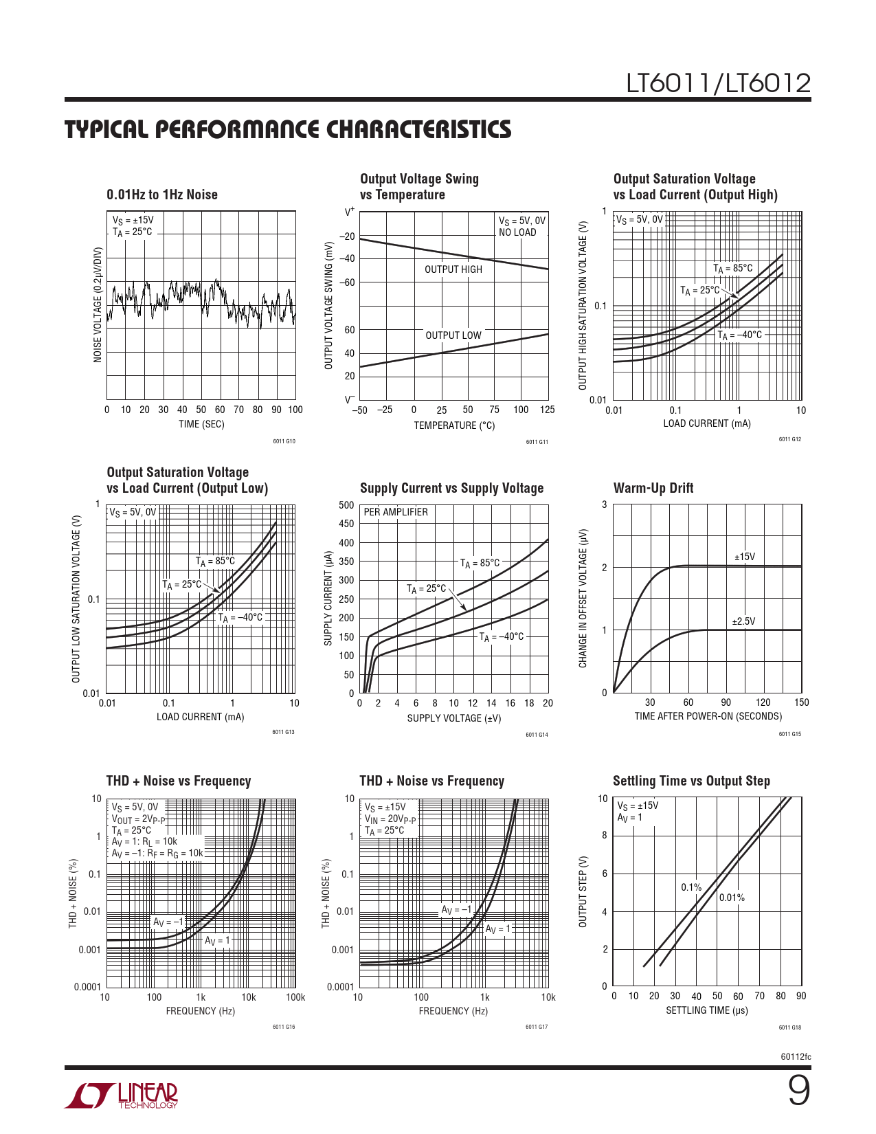 V+ 1 VS = ±15V VS = 5V, 0V VS = 5V, 0V TA = 25°C –20 NO LOAD –40 OUTPUT HIGH TA = 85°C –60 TA = 25°C 0.1 60 OUTPUT LOW TA = –40°C NOISE VOLTAGE (0.2µV/DIV) 40 OUTPUT VOLTAGE SWING (mV) 20 OUTPUT HIGH SATURATION VOLTAGE (V) V– 0.01 0 10 20 30 40 50 60 70 80 90 100 –50 –25 0 25 50 75 100 125 0.01 0.1 1 10 TIME (SEC) TEMPERATURE (°C) LOAD CURRENT (mA) 6011 G10 6011 G11 6011 G12