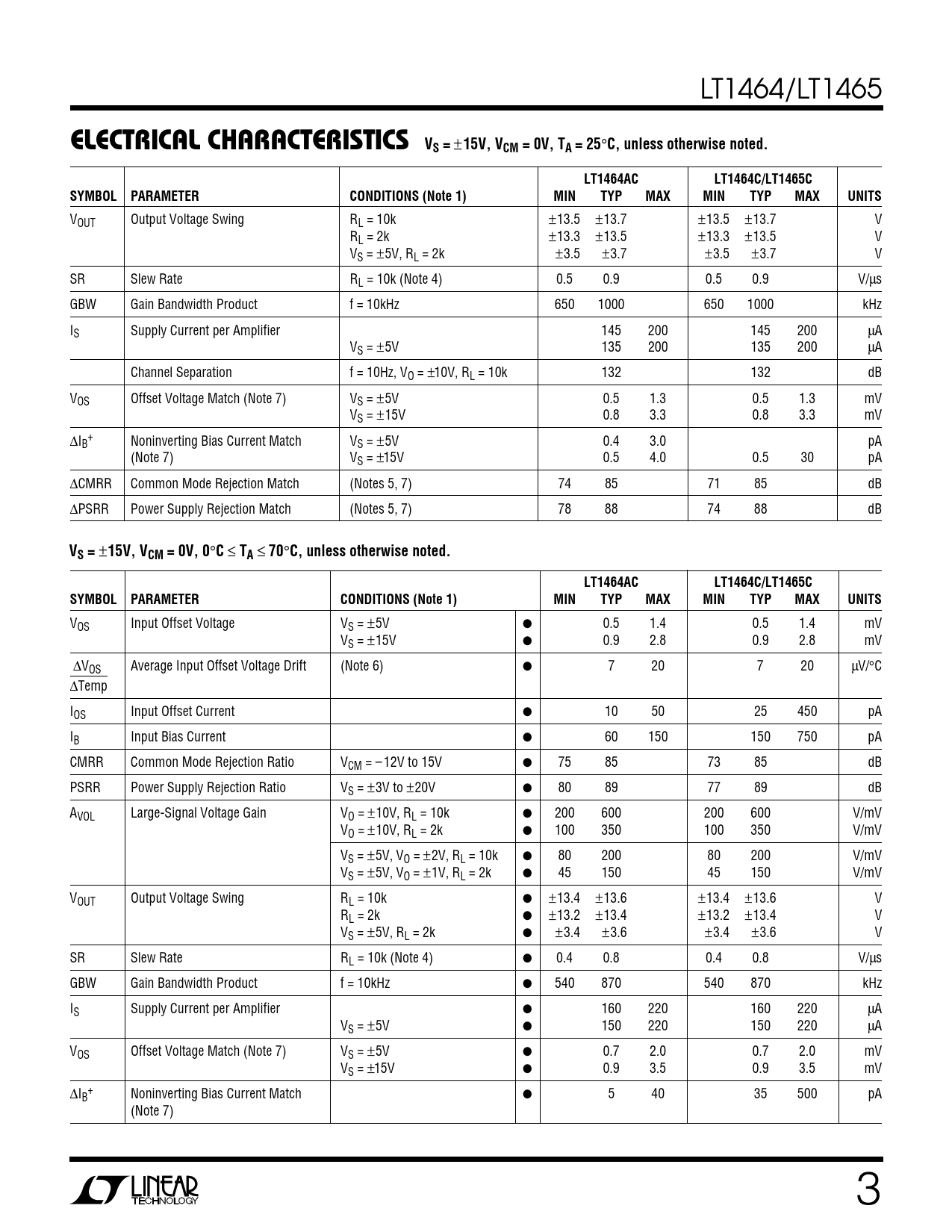 ELECTRICAL CHARACTERISTICS VS =. 15V, VCM = 0V, TA = 25. C, unless otherwise noted. LT1464AC. LT1464C/LT1465C. SYMBOL. PARAMETER