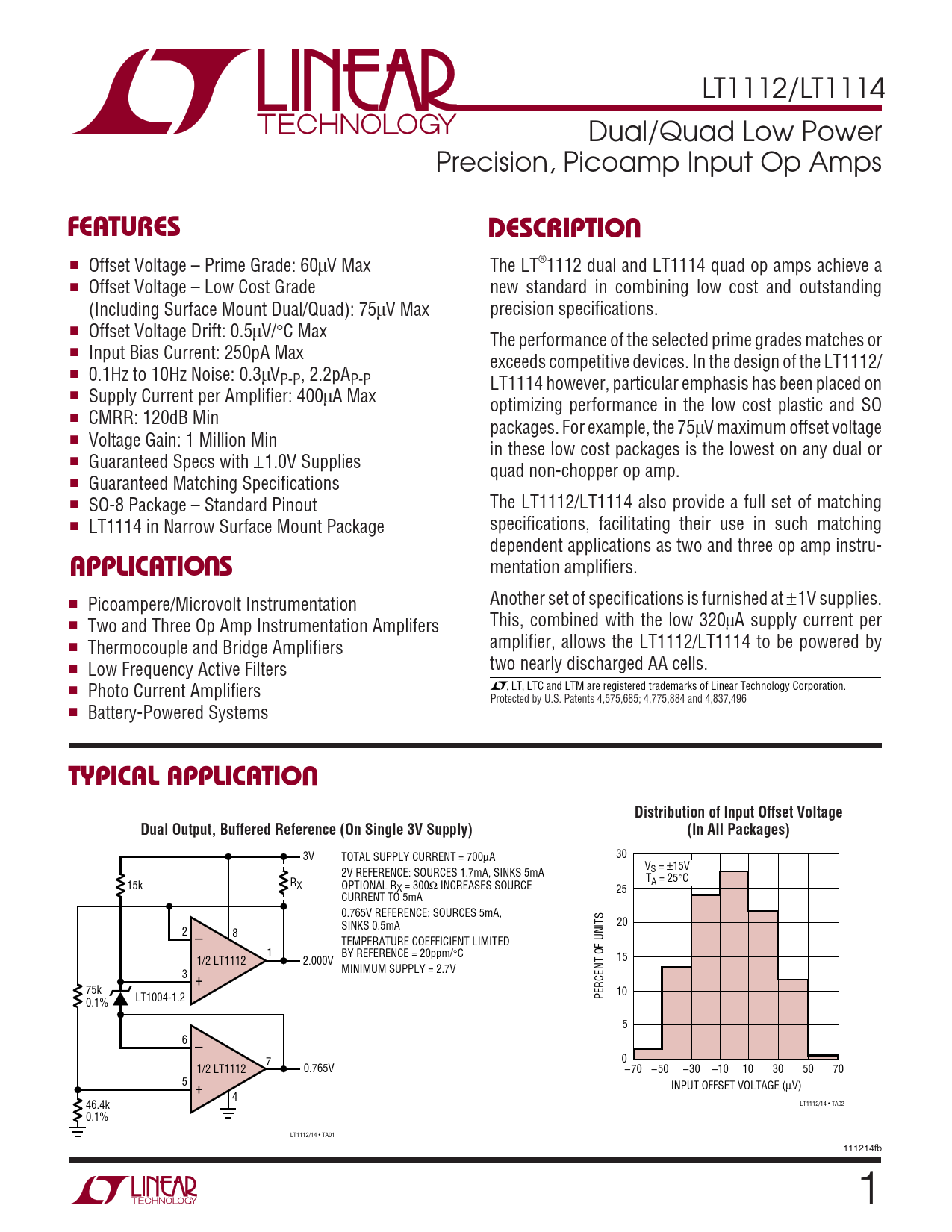 LT1112/LT1114 Dual/Quad Low Power Precision, Picoamp Input Op Amps UFEATURESDESCRIPTIO ■ Offset Voltage – Prime Grade: 60µV Max The LT®1112 dual and LT1114 quad op amps achieve a ■ Offset Voltage – Low Cost Grade new standard in combining low cost and outstanding (Including Surface Mount Dual/Quad): 75µV Max precision specifications. ■ Offset Voltage Drift: 0.5µV/°C Max The performance of the selected prime grades matches or ■ Input Bias Current: 250pA Max exceeds competitive devices. In the design of the LT1112/ ■ 0.1Hz to 10Hz Noise: 0.3µVP-P, 2.2pAP-P LT1114 however, particular emphasis has been placed on ■ Supply Current per Amplifier: 400µA Max optimizing performance in the low cost plastic and SO ■ CMRR: 120dB Min packages. For example, the 75µV maximum offset voltage ■ Voltage Gain: 1 Million Min in these low cost packages is the lowest on any dual or ■ Guaranteed Specs with ±1.0V Supplies quad non-chopper op amp. ■ Guaranteed Matching Specifications ■ SO-8 Package – Standard Pinout The LT1112/LT1114 also provide a full set of matching ■ specifications, facilitating their use in such matching LT1114 in Narrow Surface Mount Package dependent applications as two and three op amp instru- UAPPLICATIO S mentation amplifiers. Another set of specifications is furnished at ■ ±1V supplies. Picoampere/Microvolt Instrumentation This, combined with the low 320 ■ µA supply current per Two and Three Op Amp Instrumentation Amplifers amplifier, allows the LT1112/LT1114 to be powered by ■ Thermocouple and Bridge Amplifiers two nearly discharged AA cells. ■ Low Frequency Active Filters ■ Photo Current Amplifiers , LT, LTC and LTM are registered trademarks of Linear Technology Corporation. Protected by U.S. Patents 4,575,685; 4,775,884 and 4,837,496 ■ Battery-Powered Systems UTYPICAL APPLICATIODistribution of Input Offset VoltageDual Output, Buffered Reference (On Single 3V Supply)(In All Packages) 30 3V TOTAL SUPPLY CURRENT = 700µA VS = ±15V 2V REFERENCE: SOURCES 1.7mA, SINKS 5mA T R A = 25°C 15k X OPTIONAL RX = 300Ω INCREASES SOURCE 25 CURRENT TO 5mA 0.765V REFERENCE: SOURCES 5mA, 20 SINKS 0.5mA 2 – 8 TEMPERATURE COEFFICIENT LIMITED 1 BY REFERENCE = 20ppm/°C 15 1/2 LT1112 2.000V 3 + MINIMUM SUPPLY = 2.7V 75k PERCENT OF UNITS 10 LT1004-1.2 0.1% 5 6 – 0 7 1/2 LT1112 0.765V –70 –50 –30 –10 10 30 50 70 5 + INPUT OFFSET VOLTAGE (µV) 4 LT1112/14 • TA02 46.4k 0.1% LT1112/14 • TA01 111214fb 1