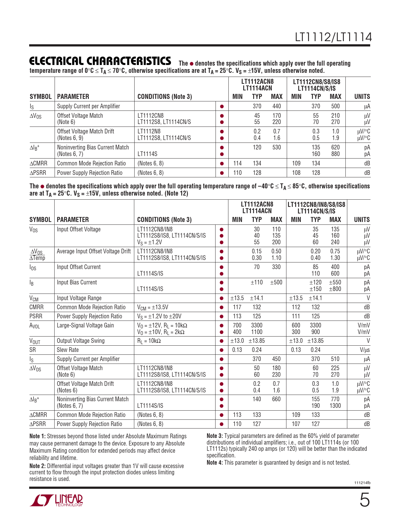 15V, unless otherwise noted. (Note 12) LT1112ACN8 LT1112CN8/IN8/S8/IS8 LT1114ACN LT1114CN/S/IS SYMBOL PARAMETER CONDITIONS (Note 3) MIN TYP MAX MIN TYP MAX UNITS