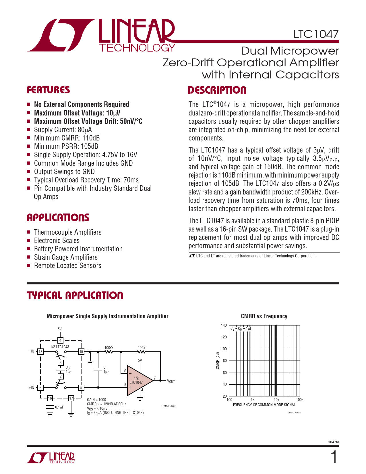 The LTC1047 is available in a standard plastic 8-pin PDIP as well as a 16-pin SW package. The LTC1047 is a plug-in ■ Thermocouple Amplifiers replacement for most dual op amps with improved DC ■ Electronic Scales performance and substantial power savings. ■ Battery Powered Instrumentation ■ Strain Gauge Amplifiers , LTC and LT are registered trademarks of Linear Technology Corporation. ■ Remote Located Sensors