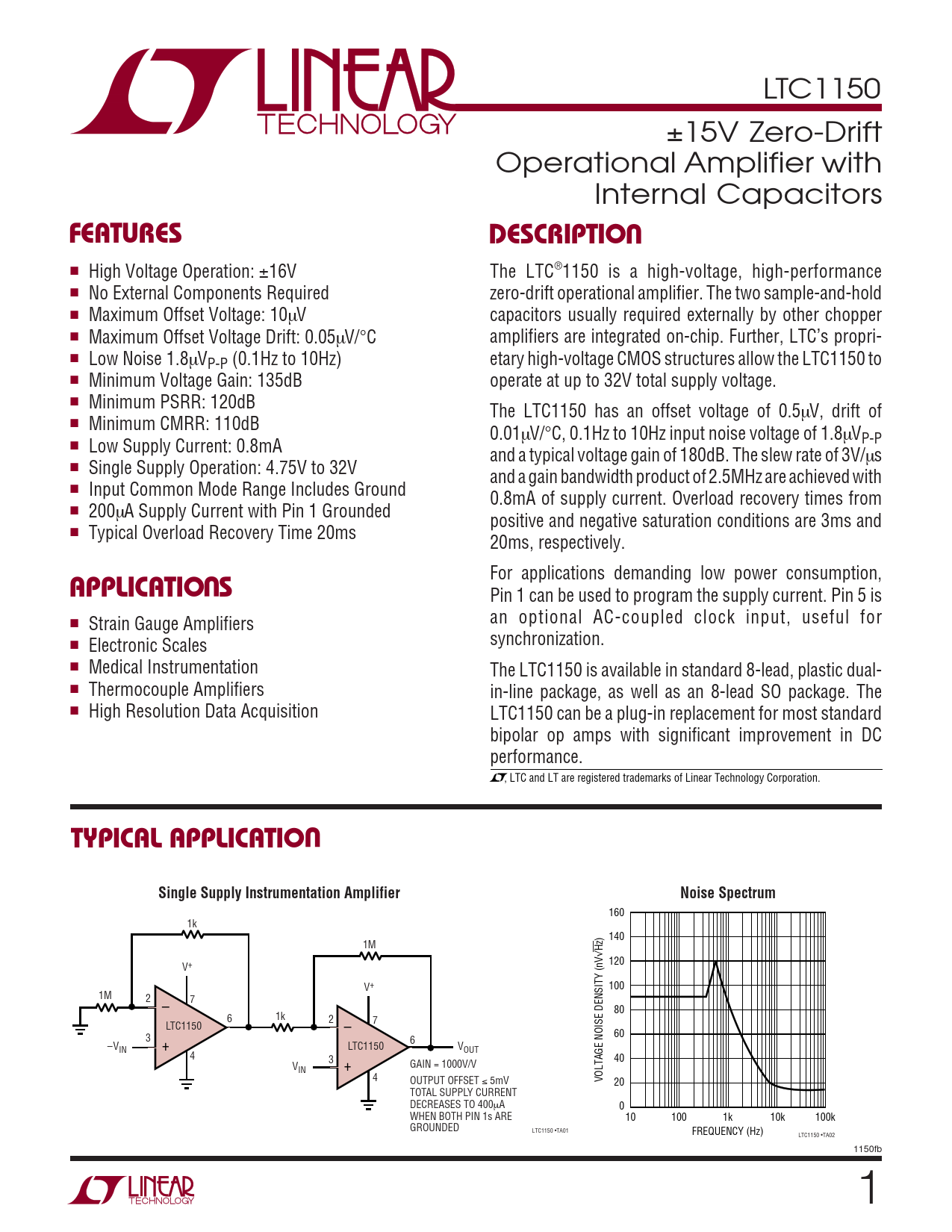 LTC1150 ±15V Zero-Drift Operational Amplifier with Internal Capacitors UFEATURESDESCRIPTIO ■ High Voltage Operation: ±16V The LTC®1150 is a high-voltage, high-performance ■ No External Components Required zero-drift operational amplifier. The two sample-and-hold ■ Maximum Offset Voltage: 10µV capacitors usually required externally by other chopper ■ Maximum Offset Voltage Drift: 0.05µV/°C amplifiers are integrated on-chip. Further, LTC’s propri- ■ Low Noise 1.8µVP-P (0.1Hz to 10Hz) etary high-voltage CMOS structures allow the LTC1150 to ■ Minimum Voltage Gain: 135dB operate at up to 32V total supply voltage. ■ Minimum PSRR: 120dB The LTC1150 has an offset voltage of 0.5µV, drift of ■ Minimum CMRR: 110dB 0.01µV/°C, 0.1Hz to 10Hz input noise voltage of 1.8µVP-P ■ Low Supply Current: 0.8mA and a typical voltage gain of 180dB. The slew rate of 3V/µs ■ Single Supply Operation: 4.75V to 32V and a gain bandwidth product of 2.5MHz are achieved with ■ Input Common Mode Range Includes Ground 0.8mA of supply current. Overload recovery times from ■ 200µA Supply Current with Pin 1 Grounded positive and negative saturation conditions are 3ms and ■ Typical Overload Recovery Time 20ms 20ms, respectively. U For applications demanding low power consumption, APPLICATIO S Pin 1 can be used to program the supply current. Pin 5 is ■ an optional AC-coupled clock input, useful for Strain Gauge Amplifiers synchronization. ■ Electronic Scales ■ Medical Instrumentation The LTC1150 is available in standard 8-lead, plastic dual- ■ Thermocouple Amplifiers in-line package, as well as an 8-lead SO package. The ■ High Resolution Data Acquisition LTC1150 can be a plug-in replacement for most standard bipolar op amps with significant improvement in DC performance. , LTC and LT are registered trademarks of Linear Technology Corporation. UTYPICAL APPLICATIOSingle Supply Instrumentation AmplifierNoise Spectrum 160 1k 140 1M Hz) √ 120 V+ V+ 100 1M 2 7 – 80 1k 6 2 7 LTC1150 – 3 60 6 –V + LTC1150 V IN OUT 4 3 40 V + GAIN = 1000V/V IN 4 OUTPUT OFFSET ≤ 5mV VOLTAGE NOISE DENSITY (nV 20 TOTAL SUPPLY CURRENT DECREASES TO 400µA 0 WHEN BOTH PIN 1s ARE 10 100 1k 10k 100k GROUNDED LTC1150 •TA01 FREQUENCY (Hz) LTC1150 •TA02 1150fb 1