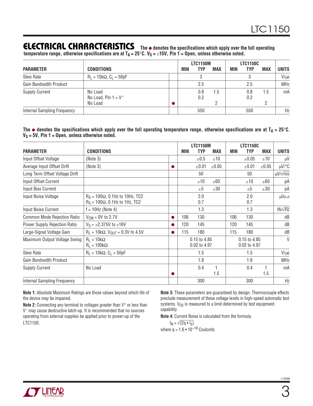 Current Noise is calculated from the formula: LTC1150. IN = √(2q • Ib) where q = 1.6 • 10–19 Coulomb. 1150fb 3