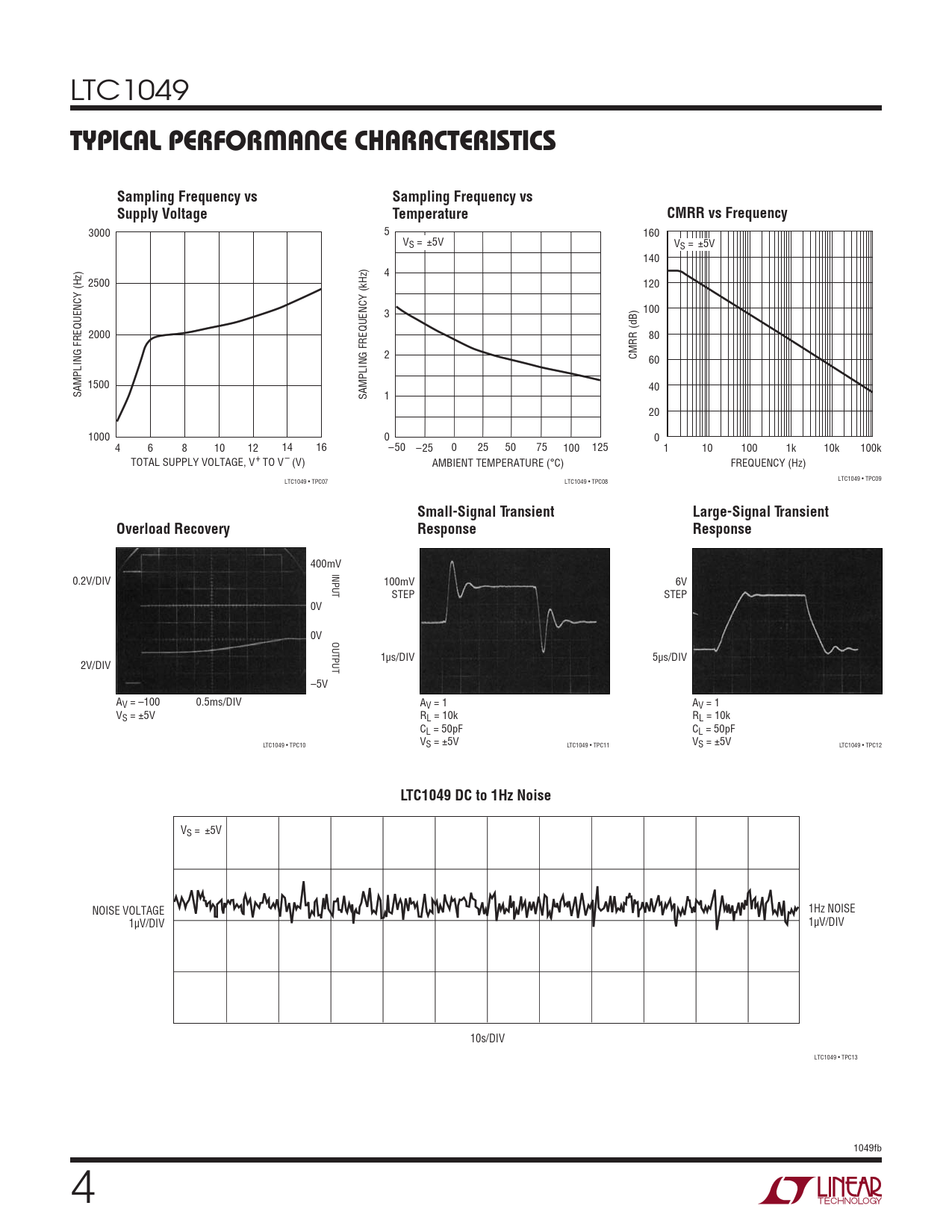 VS = ±5V NOISE VOLTAGE 1Hz NOISE 1µV/DIV 1µV/DIV 10s/DIV LTC1049 • TPC13 1049fb 4 Document Outline Features Applications Description Typical Application Absolute Maximum Ratings Package/order information Electrical Characteristics Typical Performance Characteristics Test Circuits Applications Information Typical Applications Package Description Typical Application