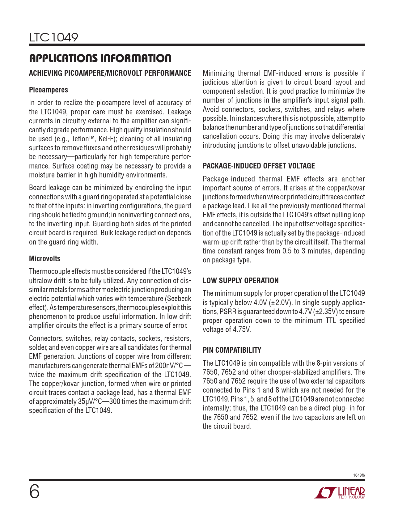 LTC1049 applicaTions inFormaTion ACHIEVING PICOAMPERE/MICROVOLT PERFORMANCE Minimizing thermal EMF-induced errors is possible if judicious attention is given to circuit board layout and Picoamperes component selection. It is good practice to minimize the In order to realize the picoampere level of accuracy of number of junctions in the amplifier’s input signal path. the LTC1049, proper care must be exercised. Leakage Avoid connectors, sockets, switches, and relays where currents in circuitry external to the amplifier can signifi- possible. In instances where this is not possible, attempt to cantly de grade performance. High quality insulation should balance the number and type of junctions so that differential be used (e.g., Teflon™, Kel-F); cleaning of all insulating cancellation occurs. Doing this may involve deliberately surfaces to remove fluxes and other residues will probably introducing junctions to offset unavoidable junctions. be necessary—particularly for high temperature perfor- mance. Surface coating may be necessary to provide a PACKAGE-INDUCED OFFSET VOLTAGE moisture barrier in high humidity environments. Package-induced thermal EMF effects are another Board leakage can be minimized by encircling the input impor tant source of errors. It arises at the copper/kovar connections with a guard ring operated at a potential close junctions formed when wire or printed circuit traces contact to that of the inputs: in inverting configurations, the guard a pack age lead. Like all the previously mentioned thermal ring should be tied to ground; in noninverting connections, EMF effects, it is outside the LTC1049’s offset nulling loop to the inverting input. Guarding both sides of the printed and cannot be cancelled. The input offset voltage specifica- circuit board is required. Bulk leakage reduction depends tion of the LTC1049 is actually set by the package-induced on the guard ring width. warm-up drift rather than by the circuit itself. The thermal time constant ranges from 0.5 to 3 minutes, depending Microvolts on package type. Thermocouple effects must be considered if the LTC1049’s ultralow drift is to be fully utilized. Any connection of dis- LOW SUPPLY OPERATION similar metals forms a thermoelectric junction produc ing an The minimum supply for proper operation of the LTC1049 electric potential which varies with temperature (Seebeck is typically below 4.0V (±2.0V). In single supply applica- effect). As temperature sensors, thermocouples exploit this tions, PSRR is guaranteed down to 4.7V (±2.35V) to ensure phenomenon to produce useful information. In low drift proper operation down to the minimum TTL specified amplifier circuits the effect is a primary source of error. voltage of 4.75V. Connectors, switches, relay contacts, sockets, resistors, solder, and even copper wire are all candidates for thermal PIN COMPATIBILITY EMF generation. Junctions of copper wire from different manufacturers can generate thermal EMFs of 200nV/°C — The LTC1049 is pin compatible with the 8-pin versions of twice the maximum drift specification of the LTC1049. 7650, 7652 and other chopper-stabilized amplifiers. The The copper/kovar junction, formed when wire or printed 7650 and 7652 require the use of two external capacitors circuit traces contact a package lead, has a thermal EMF connected to Pins 1 and 8 which are not needed for the of approximately 35µV/°C—300 times the maximum drift LTC1049. Pins 1, 5, and 8 of the LTC1049 are not connected specification of the LTC1049. internally; thus, the LTC1049 can be a direct plug- in for the 7650 and 7652, even if the two capacitors are left on the circuit board. 1049fb 6 Document Outline Features Applications Description Typical Application Absolute Maximum Ratings Package/order information Electrical Characteristics Typical Performance Characteristics Test Circuits Applications Information Typical Applications Package Description Typical Application