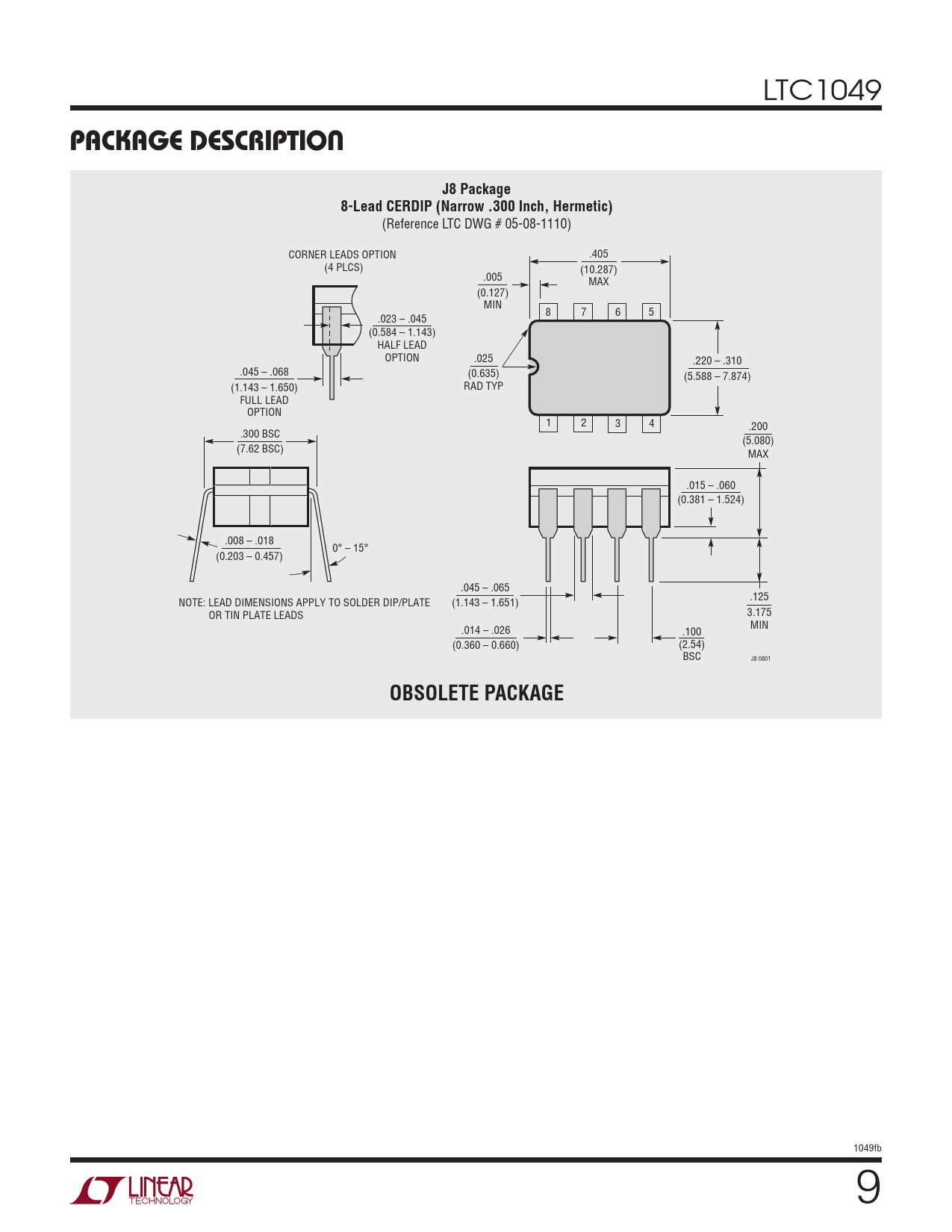 package DescripTion. J8 Package. 8-Lead CERDIP (Narrow .300 Inch, Hermetic). OBSOLETE PACKAGE