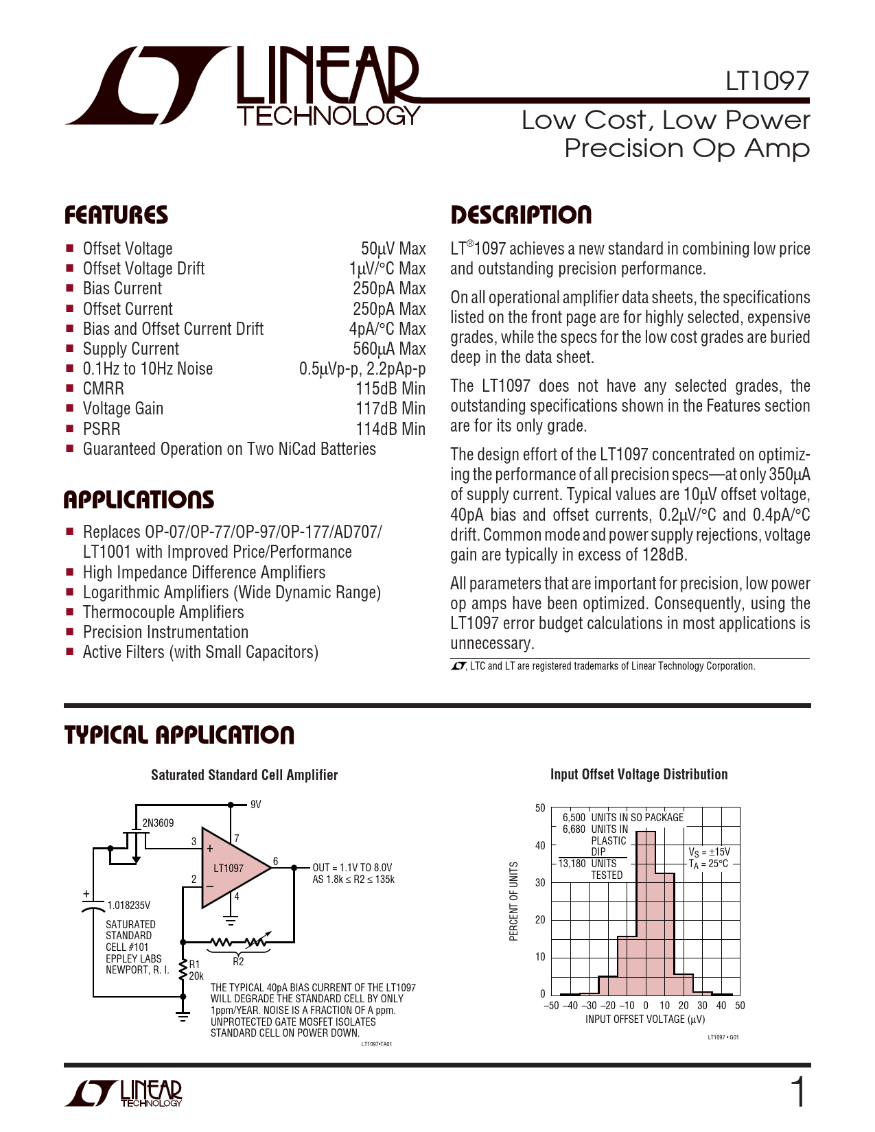 FEATURES. DESCRIPTION. APPLICATIONS. TYPICAL APPLICATION. Saturated Standard Cell Amplifier. Input Offset Voltage Distribution