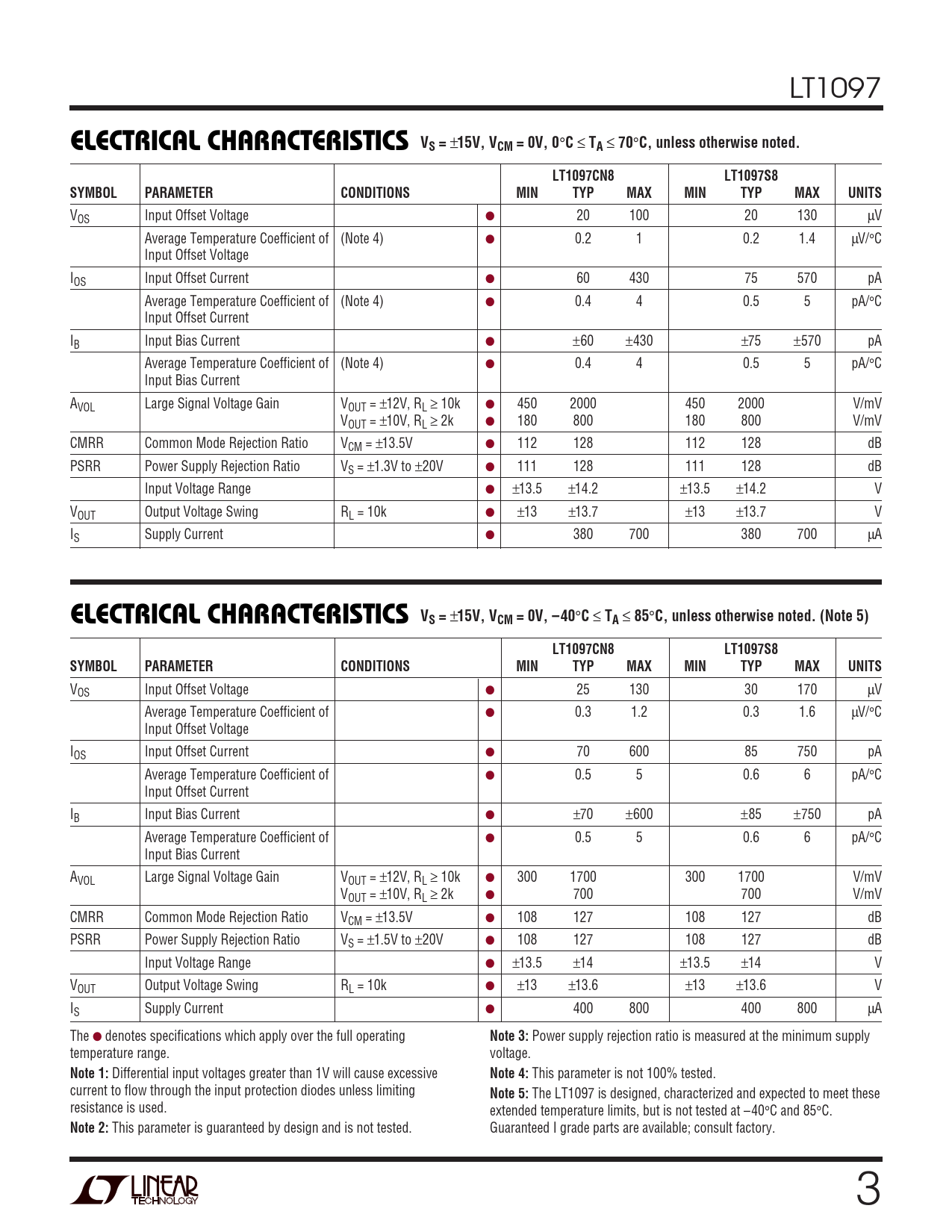 C, unless otherwise noted. (Note 5) LT1097CN8 LT1097S8 SYMBOL PARAMETER CONDITIONS MIN TYP MAX MIN TYP MAX UNITS