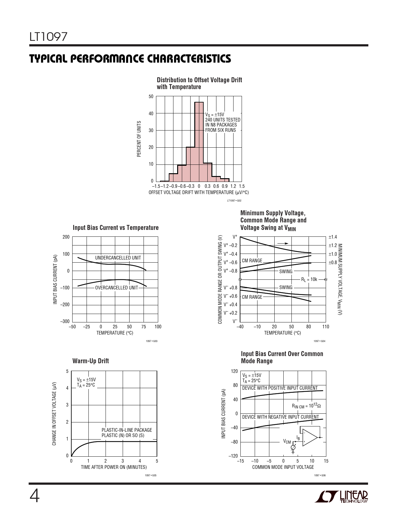 50 40 VS = ±15V 240 UNITS TESTED IN N8 PACKAGES 30 FROM SIX RUNS 20 PERCENT OF UNITS 10 0 –1.5 –1.2 –0.9 –0.6 –0.3 0 0.3 0.6 0.9 1.2 1.5 OFFSET VOLTAGE DRIFT WITH TEMPERATURE (µV/°C) LT1097 • G02