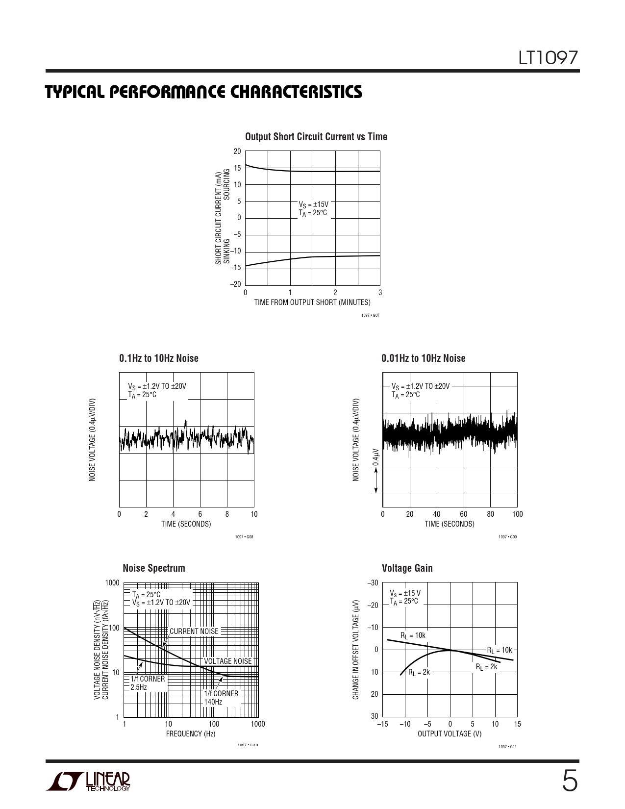 LT1097 WUTYPICAL PERFORMANCE CHARACTERISTICSOutput Short Circuit Current vs Time 20 15 10 SOURCING 5 VS = ±15V TA = 25°C 0 –5 –10 SHORT CIRCUIT CURRENT (mA) SINKING –15 –20 0 1 2 3 TIME FROM OUTPUT SHORT (MINUTES) 1097 • G07 0.1Hz to 10Hz Noise0.01Hz to 10Hz Noise VS = ±1.2V TO ±20V VS = ±1.2V TO ±20V TA = 25°C TA = 25°C µV/DIV) µV/DIV) µV 0.4 NOISE VOLTAGE (0.4 NOISE VOLTAGE (0.4 0 2 4 6 8 10 0 20 40 60 80 100 TIME (SECONDS) TIME (SECONDS) 1097 • G08 1097 • G09 Noise SpectrumVoltage Gain 1000 –30 T V A = 25°C s = ±15 V V T S = ±1.2V TO ±20V –20 A = 25°C √Hz) √Hz) µV) 100 –10 CURRENT NOISE RL = 10k 0 RL = 10k VOLTAGE NOISE RL = 2k 10 10 RL = 2k 1/f CORNER 2.5Hz 1/f CORNER VOLTAGE NOISE DENSITY (nV CURRENT NOISE DENSITY (fA CHANGE IN OFFSET VOLTAGE ( 20 140Hz 1 30 1 10 100 1000 –15 –10 –5 0 5 10 15 FREQUENCY (Hz) OUTPUT VOLTAGE (V) 1097 • G10 1097 • G11 5
