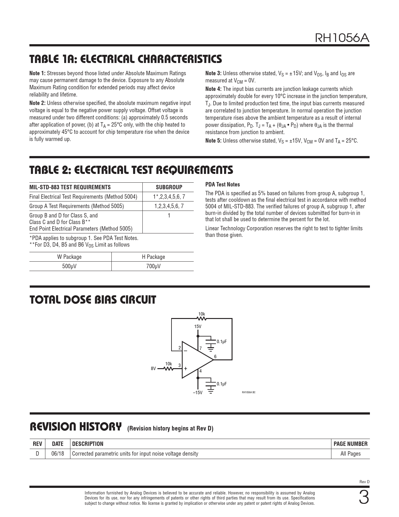 RH1056A TABLE 1A: ELECTRICAL CHARACTERISTICS Note 1: Stresses beyond those listed under Absolute Maximum Ratings Note 3: Unless otherwise stated, VS = ±15V; and VOS, IB and IOS are may cause permanent damage to the device. Exposure to any Absolute measured at VCM = 0V. Maximum Rating condition for extended periods may affect device Note 4: The input bias currents are junction leakage currents which reliability and lifetime. approximately double for every 10°C increase in the junction temperature, Note 2: Unless otherwise specified, the absolute maximum negative input TJ. Due to limited production test time, the input bias currents measured voltage is equal to the negative power supply voltage. Offset voltage is are correlated to junction temperature. In normal operation the junction measured under two different conditions: (a) approximately 0.5 seconds temperature rises above the ambient temperature as a result of internal after application of power, (b) at TA = 25°C only, with the chip heated to power dissipation, PD. TJ = TA + (θJA • PD) where θJA is the thermal approximately 45°C to account for chip temperature rise when the device resistance from junction to ambient. is fully warmed up. Note 5: Unless otherwise stated, VS = ±15V, VCM = 0V and TA = 25°C. TABLE 2: ELECTRICAL TEST REQUIREMENTS MIL-STD-883 TEST REQUIREMENTSSUBGROUPPDA Test Notes Final Electrical Test Requirements (Method 5004) 1*,2,3,4,5,6, 7 The PDA is specified as 5% based on failures from group A, subgroup 1, tests after cooldown as the final electrical test in accordance with method Group A Test Requirements (Method 5005) 1,2,3,4,5,6, 7 5004 of MIL-STD-883. The verified failures of group A, subgroup 1, after Group B and D for Class S, and 1 burn-in divided by the total number of devices submitted for burn-in in Class C and D for Class B** that lot shall be used to determine the percent for the lot. End Point Electrical Parameters (Method 5005) Linear Technology Corporation reserves the right to test to tighter limits *PDA applies to subgroup 1. See PDA Test Notes. than those given. **For D3, D4, B5 and B6 VOS Limit as follows W Package H Package 500µV 700µV TOTAL DOSE BIAS CIRCUIT 10k 15V 0.1µF 2 – 7 6 10k 3 + 8V 4 0.1µF RH1056A BC –15V REVISION HISTORY (Revision history begins at Rev D)REVDATEDESCRIPTIONPAGE NUMBER D 06/18 Corrected parametric units for input noise voltage density All Pages Rev D Information furnished by Analog Devices is believed to be accurate and reliable. However, no responsibility is assumed by Analog Devices for its use, nor for any infringements of patents or other rights of third parties that may result from its use. Specifications For more information www.a subject to change without notice. No license is granted by implication or other nalog.com wise under any patent or patent rights of Analog Devices. 3 Document Outline Package Information Burn-In Circuit Table 2: Electrical Test Requirements Total Dose Bias Circuit Revision History