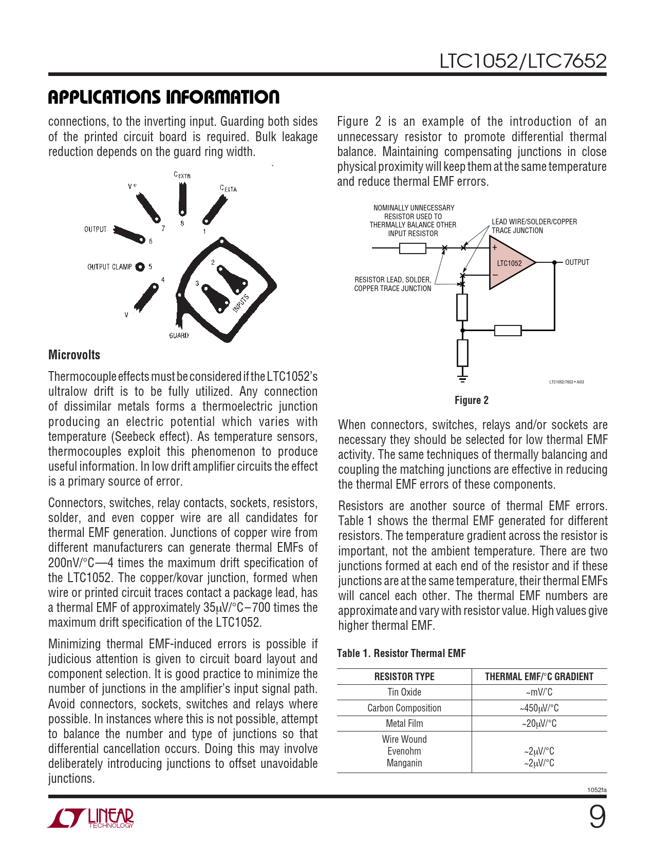 LTC1052/LTC7652 UUWUAPPLICATIO S I FOR ATIO connections, to the inverting input. Guarding both sides Figure 2 is an example of the introduction of an of the printed circuit board is required. Bulk leakage unnecessary resistor to promote differential thermal reduction depends on the guard ring width. balance. Maintaining compensating junctions in close physical proximity will keep them at the same temperature and reduce thermal EMF errors. NOMINALLY UNNECESSARY RESISTOR USED TO THERMALLY BALANCE OTHER LEAD WIRE/SOLDER/COPPER INPUT RESISTOR TRACE JUNCTION + LTC1052 OUTPUT – RESISTOR LEAD, SOLDER, COPPER TRACE JUNCTION Microvolts Thermocouple effects must be considered if the LTC1052’s LTC1052/7652 • AI03 ultralow drift is to be fully utilized. Any connection Figure 2 of dissimilar metals forms a thermoelectric junction producing an electric potential which varies with When connectors, switches, relays and/or sockets are temperature (Seebeck effect). As temperature sensors, necessary they should be selected for low thermal EMF thermocouples exploit this phenomenon to produce activity. The same techniques of thermally balancing and useful information. In low drift amplifier circuits the effect coupling the matching junctions are effective in reducing is a primary source of error. the thermal EMF errors of these components. Connectors, switches, relay contacts, sockets, resistors, Resistors are another source of thermal EMF errors. solder, and even copper wire are all candidates for Table 1 shows the thermal EMF generated for different thermal EMF generation. Junctions of copper wire from resistors. The temperature gradient across the resistor is different manufacturers can generate thermal EMFs of important, not the ambient temperature. There are two 200nV/°C—4 times the maximum drift specification of junctions formed at each end of the resistor and if these the LTC1052. The copper/kovar junction, formed when junctions are at the same temperature, their thermal EMFs wire or printed circuit traces contact a package lead, has will cancel each other. The thermal EMF numbers are a thermal EMF of approximately 35µV/°C–700 times the approximate and vary with resistor value. High values give maximum drift specification of the LTC1052. higher thermal EMF. Minimizing thermal EMF-induced errors is possible if judicious attention is given to circuit board layout and Table 1. Resistor Thermal EMF component selection. It is good practice to minimize the RESISTOR TYPETHERMAL EMF/ ° C GRADIENT number of junctions in the amplifier’s input signal path. Tin Oxide ~mV/’C Avoid connectors, sockets, switches and relays where Carbon Composition ~450µV/°C possible. In instances where this is not possible, attempt Metal Film ~20µV/°C to balance the number and type of junctions so that Wire Wound differential cancellation occurs. Doing this may involve Evenohm ~2µV/°C deliberately introducing junctions to offset unavoidable Manganin ~2µV/°C junctions. 1052fa 9