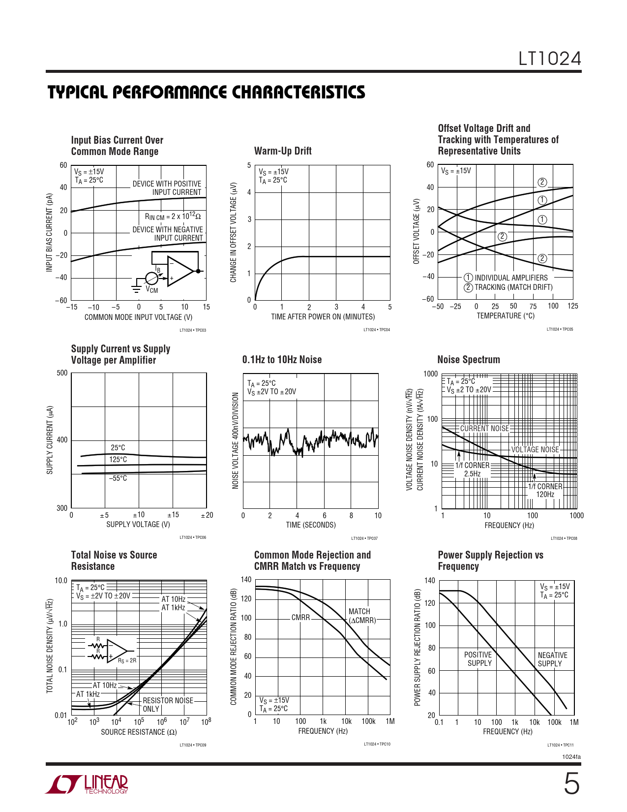 60 5 60 V V S = ±15V S = ±15V VS = ±15V T T A = 25°C A = 25°C DEVICE WITH POSITIVE 2 V) 40 40 INPUT CURRENT µ 4 V) 1 20 µ 20 RIN CM = 2 x 1012Ω 3 1 0 DEVICE WITH NEGATIVE 0 INPUT CURRENT 2 2 –20 –20 2 – OFFSET VOLTAGE ( INPUT BIAS CURRENT (pA) IB 1 –40 + – 40 CHANGE IN OFFSET VOLTAGE ( 1 INDIVIDUAL AMPLIFIERS V 2 TRACKING (MATCH DRIFT) CM – 60 0 – 60 –15 –10 – 5 0 5 10 15 0 1 2 3 4 5 – 50 –25 0 25 50 75 100 125 COMMON MODE INPUT VOLTAGE (V) TIME AFTER POWER ON (MINUTES) TEMPERATURE (°C) LT1024 • TPC03 LT1024 • TPC04 LT1024 • TPC05