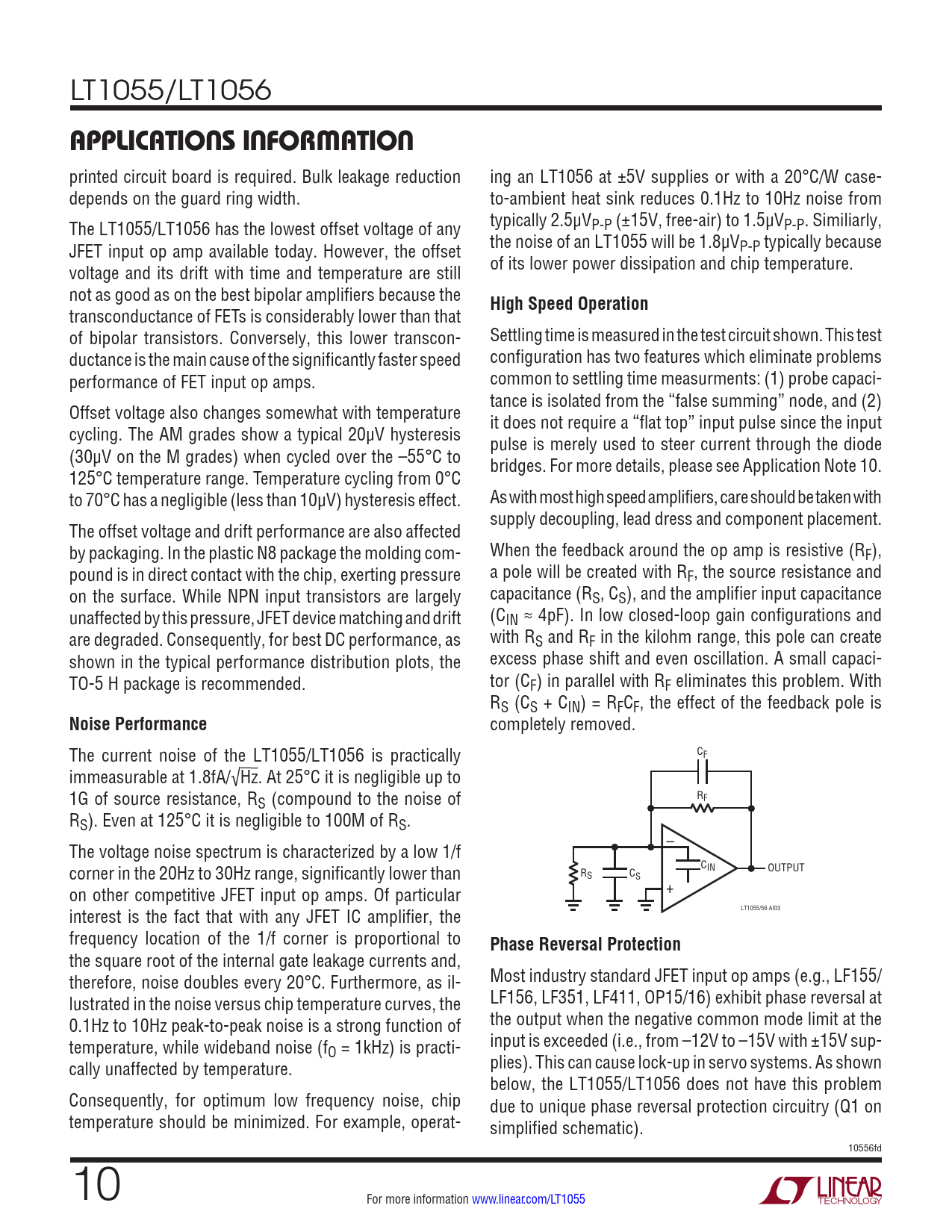 completely removed. The current noise of the LT1055/LT1056 is practically CF immeasurable at 1.8fA/√Hz. At 25°C it is negligible up to 1G of source resistance, RS (compound to the noise of RF RS). Even at 125°C it is negligible to 100M of RS. The voltage noise spectrum is characterized by a low 1/f – corner in the 20Hz to 30Hz range, significantly lower than C R IN OUTPUT S CS on other competitive JFET input op amps. Of particular + interest is the fact that with any JFET IC amplifier, the LT1055/56 AI03 frequency location of the 1/f corner is proportional to
