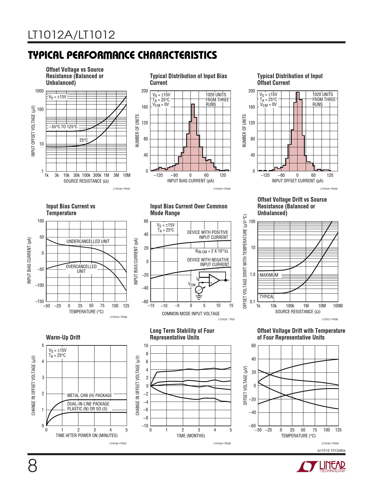 5 10 60 VS = ±15V T 8 A = 25°C µV) 40 4 µV) 6 4 µV) 20 3 2 0 0 2 METAL CAN (H) PACKAGE –2 –20 DUAL-IN-LINE PACKAGE –4 OFFSET VOLTAGE ( 1 PLASTIC (N) OR SO (S) –6 CHANGE IN OFFSET VOLTAGE ( CHANGE IN OFFSET VOLTAGE ( – 40 –8 0 –10 – 60 0 1 2 3 4 5 0 1 2 3 4 5 – 50 –25 0 25 50 75 100 125 TIME AFTER POWER ON (MINUTES) TIME (MONTHS) TEMPERATURE (°C) LT1012A • TPC07 LT1012A • TPC08 LT1012A • TPC09 sn1012 1012afbs 8