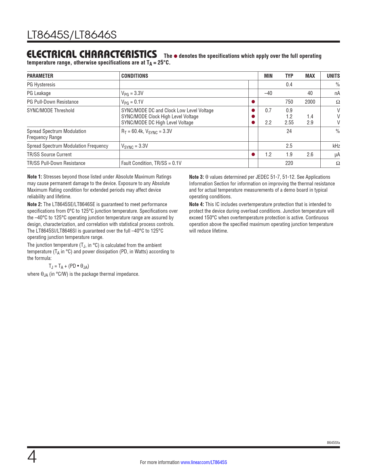LT8645S/LT8646S ELECTRICAL CHARACTERISTICS The l denotes the specifications which apply over the full operatingtemperature range, otherwise specifications are at TA = 25°C.PARAMETERCONDITIONSMINTYPMAXUNITS PG Hysteresis 0.4 % PG Leakage VPG = 3.3V –40 40 nA PG Pull-Down Resistance VPG = 0.1V l 750 2000 Ω SYNC/MODE Threshold SYNC/MODE DC and Clock Low Level Voltage l 0.7 0.9 V SYNC/MODE Clock High Level Voltage l 1.2 1.4 V SYNC/MODE DC High Level Voltage l 2.2 2.55 2.9 V Spread Spectrum Modulation RT = 60.4k, VSYNC = 3.3V 24 % Frequency Range Spread Spectrum Modulation Frequency VSYNC = 3.3V 2.5 kHz TR/SS Source Current l 1.2 1.9 2.6 µA TR/SS Pull-Down Resistance Fault Condition, TR/SS = 0.1V 220 Ω Note 1: Stresses beyond those listed under Absolute Maximum Ratings Note 3: θ values determined per JEDEC 51-7, 51-12. See Applications may cause permanent damage to the device. Exposure to any Absolute Information Section for information on improving the thermal resistance Maximum Rating condition for extended periods may affect device and for actual temperature measurements of a demo board in typical reliability and lifetime. operating conditions. Note 2: The LT8645SE/LT8646SE is guaranteed to meet performance Note 4: This IC includes overtemperature protection that is intended to specifications from 0°C to 125°C junction temperature. Specifications over protect the device during overload conditions. Junction temperature will the –40°C to 125°C operating junction temperature range are assured by exceed 150°C when overtemperature protection is active. Continuous design, characterization, and correlation with statistical process controls. operation above the specified maximum operating junction temperature The LT8645SI/LT8646SI is guaranteed over the full –40°C to 125°C will reduce lifetime. operating junction temperature range. The junction temperature (TJ, in °C) is calculated from the ambient temperature (TA in °C) and power dissipation (PD, in Watts) according to the formula: TJ = TA + (PD • θJA) where θJA (in °C/W) is the package thermal impedance. 8645Sfa 4 For more information www.linear.com/LT8645S