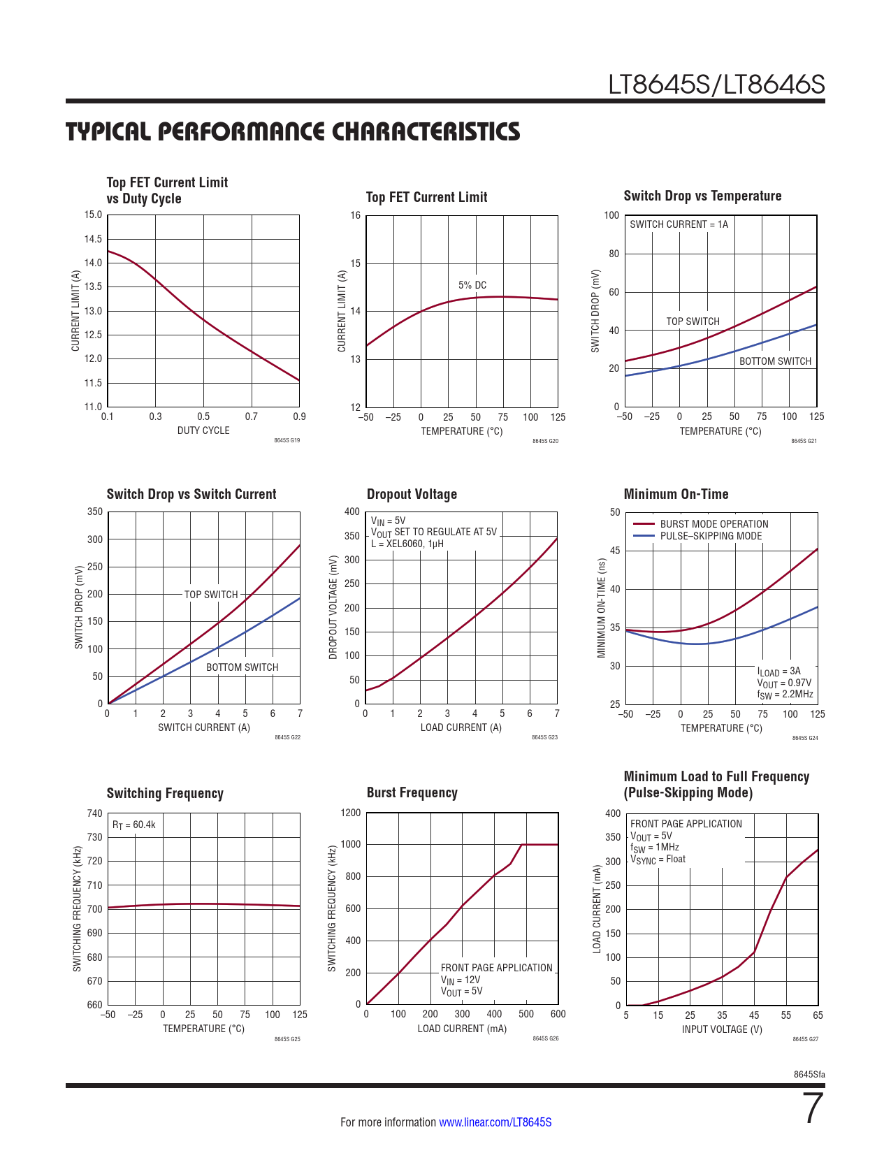 350 400 50 VIN = 5V BURST MODE OPERATION V 300 350 OUT SET TO REGULATE AT 5V PULSE–SKIPPING MODE L = XEL6060, 1µH 45 300 250 250 200 TOP SWITCH 40 TAGE (mV) 200 150 150 35 SWITCH DROP (mV) 100 DROPOUT VOL 100 MINIMUM ON-TIME (ns) BOTTOM SWITCH 30 50 I 50 LOAD = 3A VOUT = 0.97V fSW = 2.2MHz 0 0 25 0 1 2 3 4 5 6 7 0 1 2 3 4 5 6 7 –50 –25 0 25 50 75 100 125 SWITCH CURRENT (A) LOAD CURRENT (A) TEMPERATURE (°C) 8645S G22 8645S G23 8645S G24