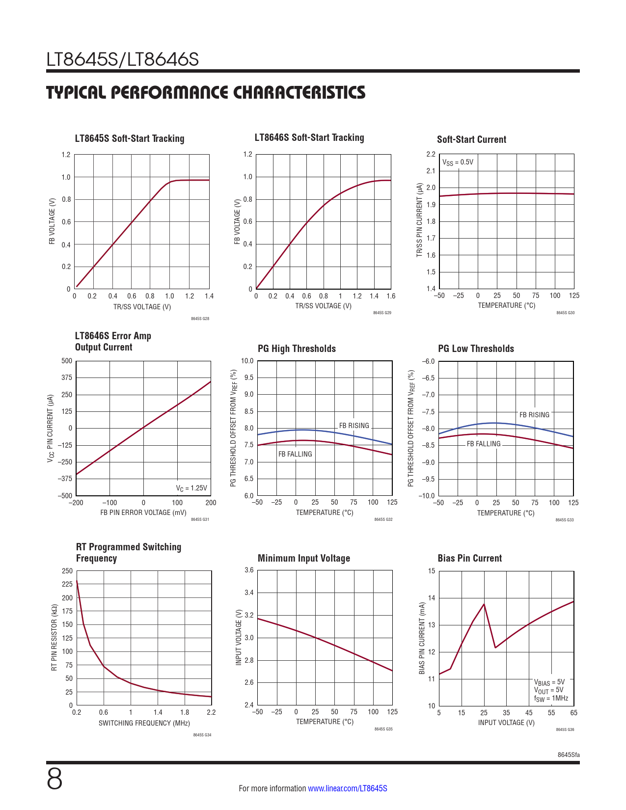 500 10.0 –6.0 375 9.5 (%) –6.5 (%) REF REF 250 9.0 –7.0 125 8.5 –7.5 FB RISING 0 FB RISING 8.0 –8.0 –125 –8.5 FB FALLING PIN CURRENT (µA) 7.5 FB FALLING V CC –250 7.0 –9.0 –375 6.5 –9.5 V PG THRESHOLD OFFSET FROM V PG THRESHOLD OFFSET FROM V C = 1.25V –500 6.0 –10.0 –200 –100 0 100 200 –50 –25 0 25 50 75 100 125 –50 –25 0 25 50 75 100 125 FB PIN ERROR VOLTAGE (mV) TEMPERATURE (°C) TEMPERATURE (°C) 8645S G31 8645S G32 8645S G33
