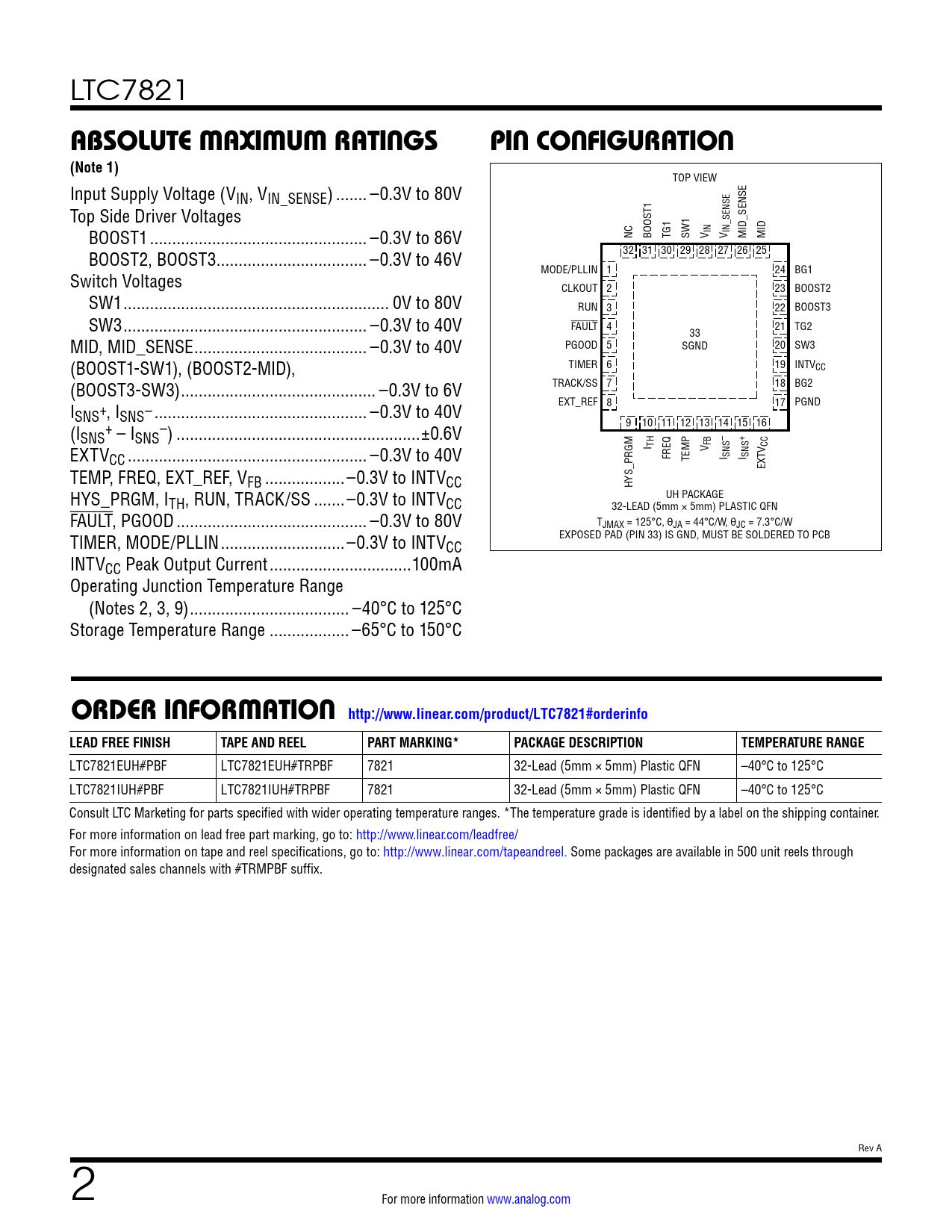 LTC7821EUH#PBF LTC7821EUH#TRPBF 7821 32-Lead (5mm × 5mm) Plastic QFN –40°C to 125°C LTC7821IUH#PBF LTC7821IUH#TRPBF 7821 32-Lead (5mm × 5mm) Plastic QFN –40°C to 125°C Consult LTC Marketing for parts specified with wider operating temperature ranges. *The temperature grade is identified by a label on the shipping container. For more information on lead free part marking, go to: http://www.linear.com/leadfree/ For more information on tape and reel specifications, go to: http://www.linear.com/tapeandreel. Some packages are available in 500 unit reels through designated sales channels with #TRMPBF suffix. Rev A 2 For more information www.analog.com Document Outline Features Applications Typical Application Description Absolute Maximum Ratings Order Information Pin Configuration Electrical Characteristics Typical Performance Characteristics Pin Functions Block Diagram Operation Applications Information Package Description Revision History Related Parts