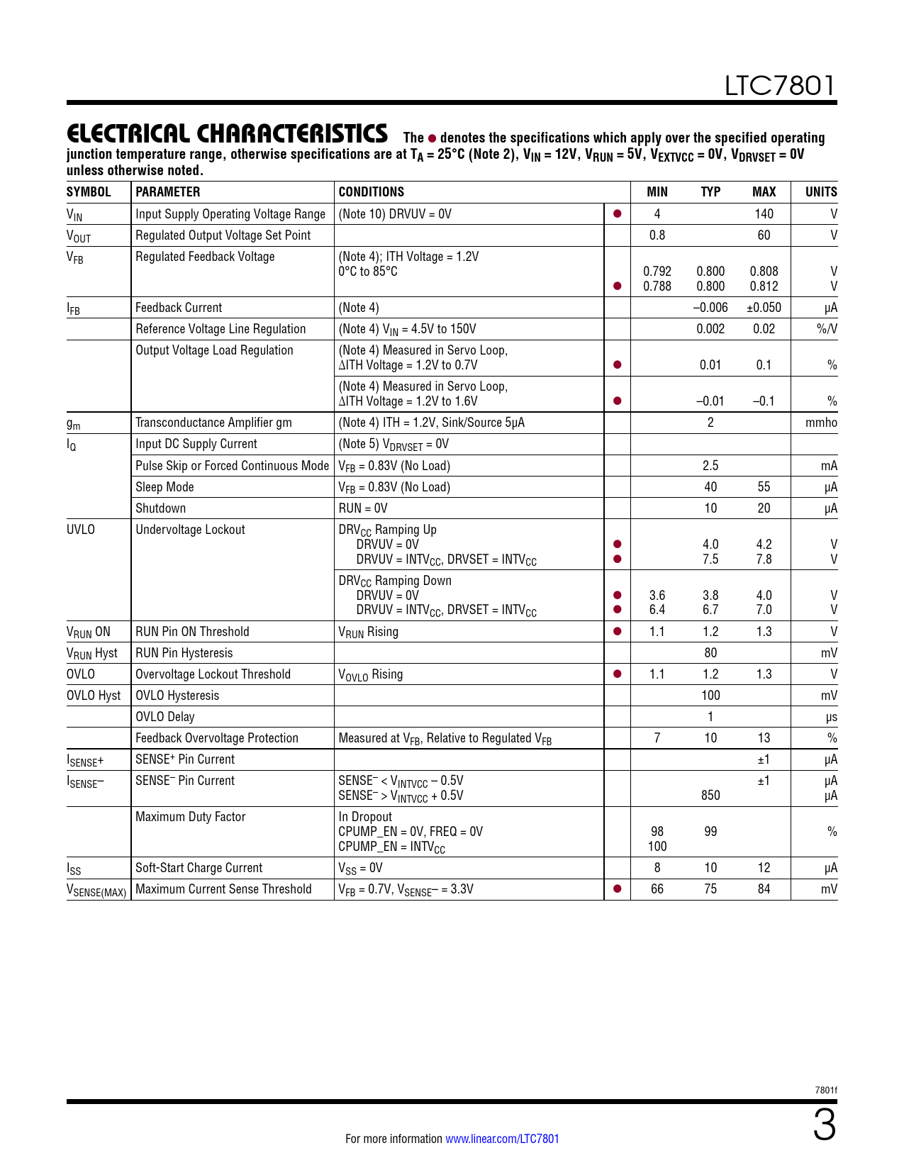 VIN Input Supply Operating Voltage Range (Note 10) DRVUV = 0V l 4 140 V VOUT Regulated Output Voltage Set Point 0.8 60 V VFB Regulated Feedback Voltage (Note 4); ITH Voltage = 1.2V 0°C to 85°C 0.792 0.800 0.808 V l 0.788 0.800 0.812 V IFB Feedback Current (Note 4) –0.006 ±0.050 µA Reference Voltage Line Regulation (Note 4) VIN = 4.5V to 150V 0.002 0.02 %/V Output Voltage Load Regulation (Note 4) Measured in Servo Loop, ∆ITH Voltage = 1.2V to 0.7V l 0.01 0.1 % (Note 4) Measured in Servo Loop, ∆ITH Voltage = 1.2V to 1.6V l –0.01 –0.1 % gm Transconductance Amplifier gm (Note 4) ITH = 1.2V, Sink/Source 5µA 2 mmho IQ Input DC Supply Current (Note 5) VDRVSET = 0V Pulse Skip or Forced Continuous Mode VFB = 0.83V (No Load) 2.5 mA Sleep Mode VFB = 0.83V (No Load) 40 55 µA Shutdown RUN = 0V 10 20 µA UVLO Undervoltage Lockout DRVCC Ramping Up DRVUV = 0V l 4.0 4.2 V DRVUV = INTVCC, DRVSET = INTVCC l 7.5 7.8 V DRVCC Ramping Down DRVUV = 0V l 3.6 3.8 4.0 V DRVUV = INTVCC, DRVSET = INTVCC l 6.4 6.7 7.0 V VRUN ON RUN Pin ON Threshold VRUN Rising l 1.1 1.2 1.3 V VRUN Hyst RUN Pin Hysteresis 80 mV OVLO Overvoltage Lockout Threshold VOVLO Rising l 1.1 1.2 1.3 V OVLO Hyst OVLO Hysteresis 100 mV OVLO Delay 1 µs Feedback Overvoltage Protection Measured at VFB, Relative to Regulated VFB 7 10 13 % ISENSE+ SENSE+ Pin Current ±1 µA ISENSE– SENSE– Pin Current SENSE– < VINTVCC – 0.5V ±1 µA SENSE– > VINTVCC + 0.5V 850 µA Maximum Duty Factor In Dropout CPUMP_EN = 0V, FREQ = 0V 98 99 % CPUMP_EN = INTVCC 100 ISS Soft-Start Charge Current VSS = 0V 8 10 12 µA VSENSE(MAX) Maximum Current Sense Threshold VFB = 0.7V, VSENSE– = 3.3V l 66 75 84 mV 7801f For more information www.linear.com/LTC7801 3 Document Outline Features Description Applications Typical Application Absolute Maximum Ratings Pin Configuration Order Information Electrical Characteristics Typical Performance Characteristics Pin Functions Functional Diagram Operation Applications Information Typical Applications Package Description Typical Application Related Parts
