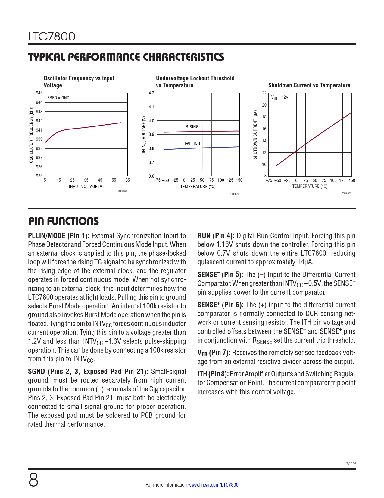 945 4.2 22 FREQ = GND VIN = 12V 944 4.1 20 943 18 942 4.0 RISING 941 16 3.9 939 VOLTAGE (V) CC 14 FALLING 938 3.8 INTV 12 937 SHUTDOWN CURRENT (µA) OSCILLATOR FREQUENCY (kHz) 3.7 936 10 935 3.6 8 5 15 25 35 45 55 65 –75 –50 –25 0 25 50 75 100 125 150 –75 –50 –25 0 25 50 75 100 125 150 INPUT VOLTAGE (V) TEMPERATURE (°C) TEMPERATURE (°C) 7800 G25 7800 G26 7800 G27