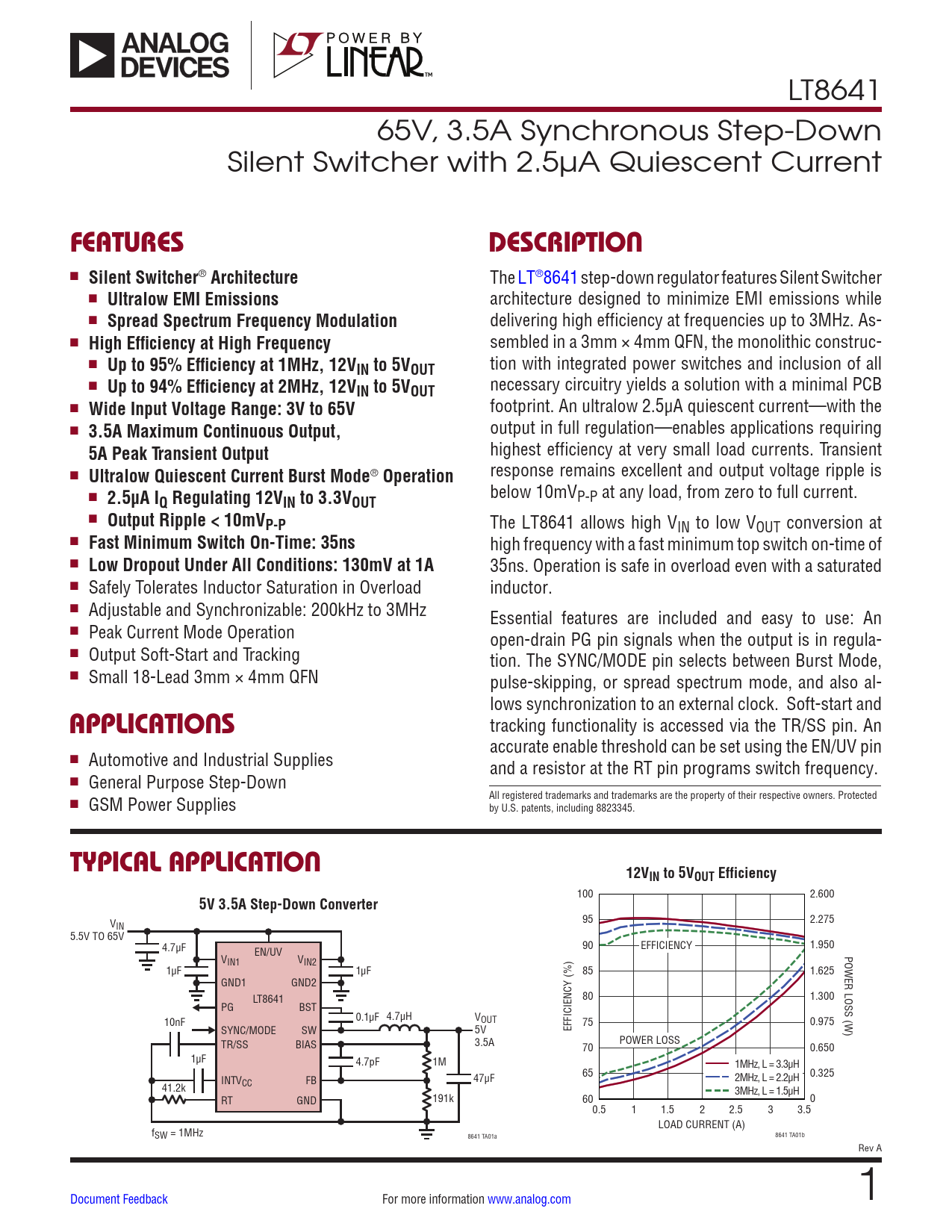 LT8641 65V, 3.5A Synchronous Step-Down Silent Switcher with 2.5µA Quiescent Current FEATURESDESCRIPTION n Silent Switcher ® Architecture The LT®8641 step-down regulator features Silent Switcher n Ultralow EMI Emissions architecture designed to minimize EMI emissions while n Spread Spectrum Frequency Modulation delivering high efficiency at frequencies up to 3MHz. As- n High Efficiency at High Frequency sembled in a 3mm × 4mm QFN, the monolithic construc- n Up to 95% Efficiency at 1MHz, 12V tion with integrated power switches and inclusion of all IN to 5VOUT n Up to 94% Efficiency at 2MHz, 12V necessary circuitry yields a solution with a minimal PCB IN to 5VOUT n Wide Input Voltage Range: 3V to 65V footprint. An ultralow 2.5µA quiescent current—with the n 3.5A Maximum Continuous Output, output in full regulation—enables applications requiring highest efficiency at very small load currents. Transient 5A Peak Transient Output n response remains excellent and output voltage ripple is Ultralow Quiescent Current Burst Mode ® Operation n below 10mV 2.5μA I P-P at any load, from zero to full current. Q Regulating 12VIN to 3.3VOUT n Output Ripple < 10mVP-P The LT8641 allows high VIN to low VOUT conversion at n Fast Minimum Switch On-Time: 35ns high frequency with a fast minimum top switch on-time of n Low Dropout Under All Conditions: 130mV at 1A 35ns. Operation is safe in overload even with a saturated n Safely Tolerates Inductor Saturation in Overload inductor. n Adjustable and Synchronizable: 200kHz to 3MHz Essential features are included and easy to use: An n Peak Current Mode Operation open-drain PG pin signals when the output is in regula- n Output Soft-Start and Tracking tion. The SYNC/MODE pin selects between Burst Mode, n Small 18-Lead 3mm × 4mm QFN pulse-skipping, or spread spectrum mode, and also al- lows synchronization to an external clock. Soft-start and APPLICATIONS tracking functionality is accessed via the TR/SS pin. An accurate enable threshold can be set using the EN/UV pin n Automotive and Industrial Supplies and a resistor at the RT pin programs switch frequency. n General Purpose Step-Down n GSM Power Supplies All registered trademarks and trademarks are the property of their respective owners. Protected by U.S. patents, including 8823345. TYPICAL APPLICATION12VIN to 5VOUT Efficiency 100 2.600 5V 3.5A Step-Down Converter V 95 2.275 IN 5.5V TO 65V 4.7µF 90 1.950 EN/UV EFFICIENCY POWER LOSS (W) VIN1 VIN2 1µF 1µF 85 1.625 GND1 GND2 LT8641 80 1.300 PG BST 0.1µF 4.7µH VOUT 10nF 75 0.975 SYNC/MODE SW 5V EFFICIENCY (%) TR/SS BIAS 3.5A POWER LOSS 70 0.650 1µF 4.7pF 1M 1MHz, L = 3.3μH 65 0.325 INTVCC FB 47µF 2MHz, L = 2.2μH 41.2k 3MHz, L = 1.5μH RT GND 191k 60 0 0.5 1 1.5 2 2.5 3 3.5 LOAD CURRENT (A) fSW = 1MHz 8641 TA01a 8641 TA01b Rev A Document Feedback For more information www.analog.com 1 Document Outline Features Applications Description Typical Application Absolute Maximum Ratings Pin Configuration Order Information Electrical Characteristics Typical Performance Characteristics Pin Functions Block Diagram Operation Applications Information Typical Applications Package Description Typical Applications Related Parts