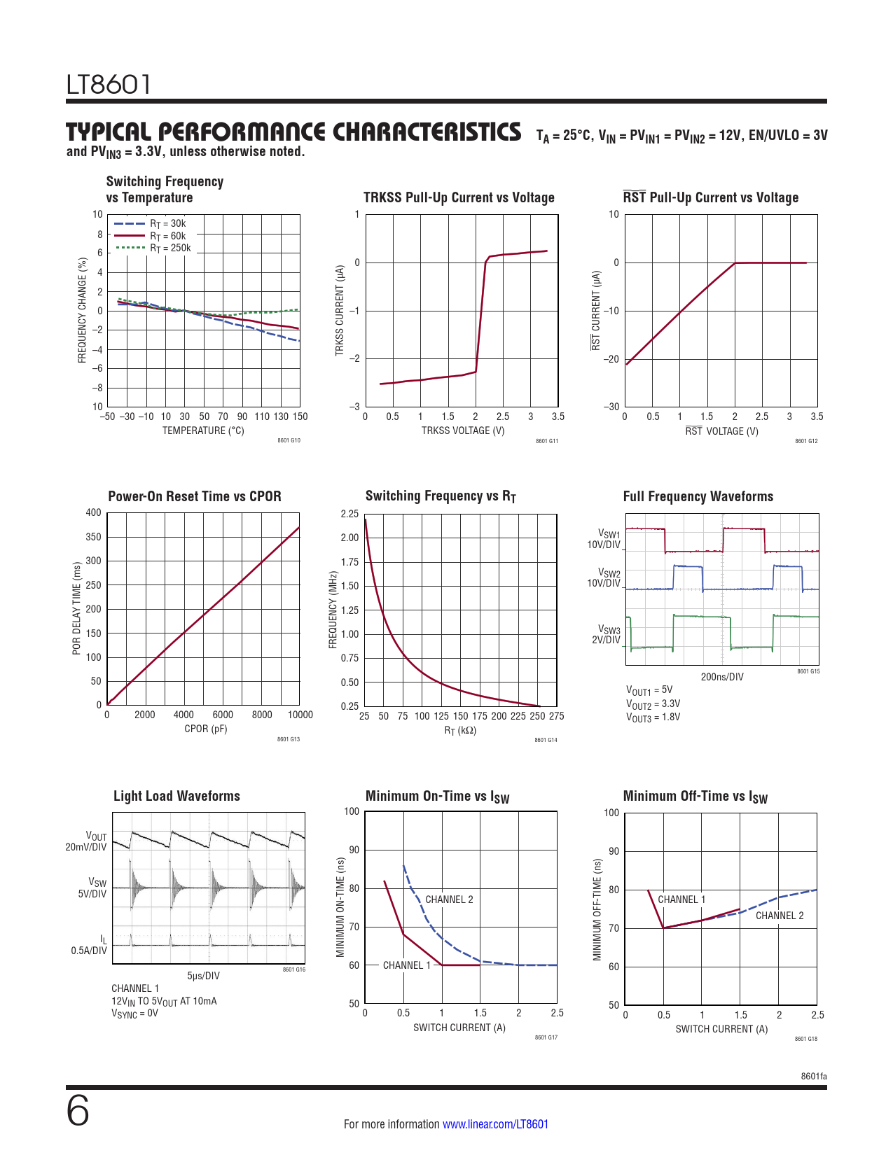 400 2.25 350 2.00 VSW1 10V/DIV 300 1.75 VSW2 250 1.50 10V/DIV Y TIME (ms) 200 1.25 150 1.00 VSW3 2V/DIV POR DELA FREQUENCY (MHz) 100 0.75 8601 G15 50 0.50 200ns/DIV VOUT1 = 5V 0 0.25 VOUT2 = 3.3V 0 2000 4000 6000 8000 10000 25 50 75 100 125 150 175 200 225 250 275 VOUT3 = 1.8V CPOR (pF) RT (kΩ) 8601 G13 8601 G14
