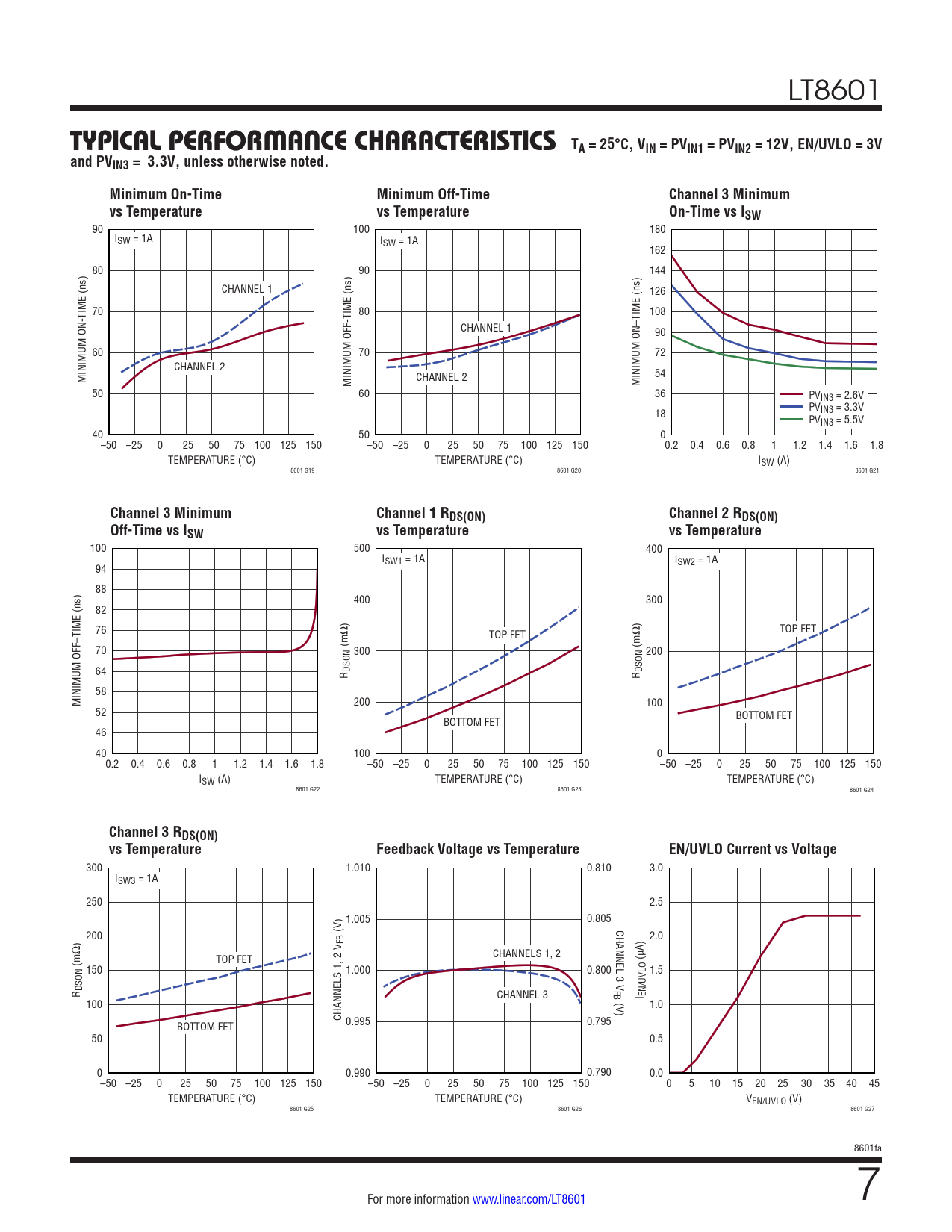 90 100 180 ISW = 1A ISW = 1A 162 80 90 144 CHANNEL 1 126 70 80 108 CHANNEL 1 90 60 70 72 CHANNEL 2 MINIMUM ON-TIME (ns) 54 MINIMUM OFF-TIME (ns) CHANNEL 2 MINIMUM ON–TIME (ns) 50 60 36 PVIN3 = 2.6V PVIN3 = 3.3V 18 PVIN3 = 5.5V 40 50 0 –50 –25 0 25 50 75 100 125 150 –50 –25 0 25 50 75 100 125 150 0.2 0.4 0.6 0.8 1 1.2 1.4 1.6 1.8 TEMPERATURE (°C) TEMPERATURE (°C) ISW (A) 8601 G19 8601 G20 8601 G21