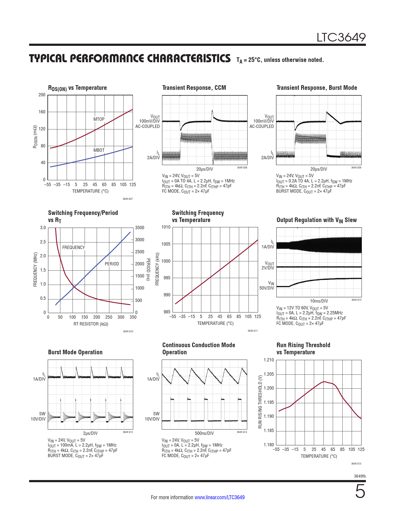 200 160 V V MTOP OUT OUT 100mV/DIV 100mV/DIV 120 AC-COUPLED AC-COUPLED (mΩ) R DSON 80 MBOT IL IL 2A/DIV 2A/DIV 40 3649 G08 20µs/DIV 3649 G09 20µs/DIV VIN = 24V, VOUT = 5V VIN = 24V, VOUT = 5V 0 I I –55 –35 –15 5 25 45 65 85 105 125 OUT = 0A TO 4A, L = 2.2µH, fSW = 1MHz OUT = 0.2A TO 4A, L = 2.2µH, fSW = 1MHz RITH = 4kΩ, CITH = 2.2nF, CITHP = 47pF RITH = 4kΩ, CITH = 2.2nF, CITHP = 47pF TEMPERATURE (°C) FC MODE, COUT = 2× 47µF BURST MODE, COUT = 2× 47µF 3649 G07