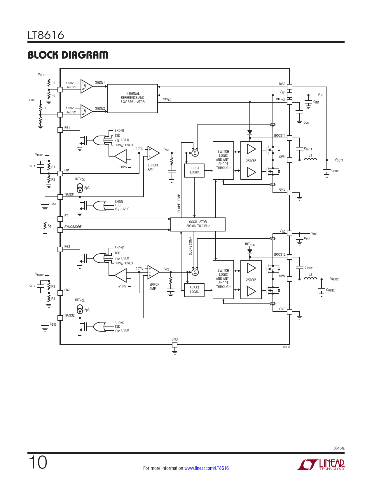 VIN1 R5 1.03V + SHDN1 BIAS EN/UV1 – INTERNAL VIN1 R6 VIN1 REFERENCE AND VIN2 INTV INTV 3.3V REGULATOR CC CC CIN1 R7 1.03V + SHDN2 EN/UV2 – R8 CVCC PG1 SHDN1 TSD BOOST1 VIN1 UVLO INTVCC UVLO 0.79V + VC1 CBST1 SWITCH VOUT1 +– LOGIC SW1 L1 AND ANTI- DRIVER VOUT1 SHOOT CFF1 R1 ±10% ERROR BURST THROUGH FB1 AMP LOGIC COUT1 R2 INTVCC 2µA GND TR/SS1 C SHDN1 SS1 TSD VIN1 UVLO SLOPE COMP RT OSCILLATOR RT 200kHz TO 3MHz SYNC/MODE VIN2 VIN2 CIN2 INTVCC PG2 SHDN2 TSD SLOPE COMP BOOST2 VIN1 UVLO INTVCC UVLO 0.79V + C V BST2 C2 SWITCH VOUT2 +– LOGIC L2 SW2 AND ANTI- V DRIVER OUT2 SHOOT CFF2 R3 ERROR ±10% BURST THROUGH FB2 AMP C LOGIC OUT2 R4 INTVCC 2µA GND TR/SS2 C SHDN2 SS2 TSD VIN1 UVLO GND 8616 BD 8616fa 10 For more information www.linear.com/LT8616