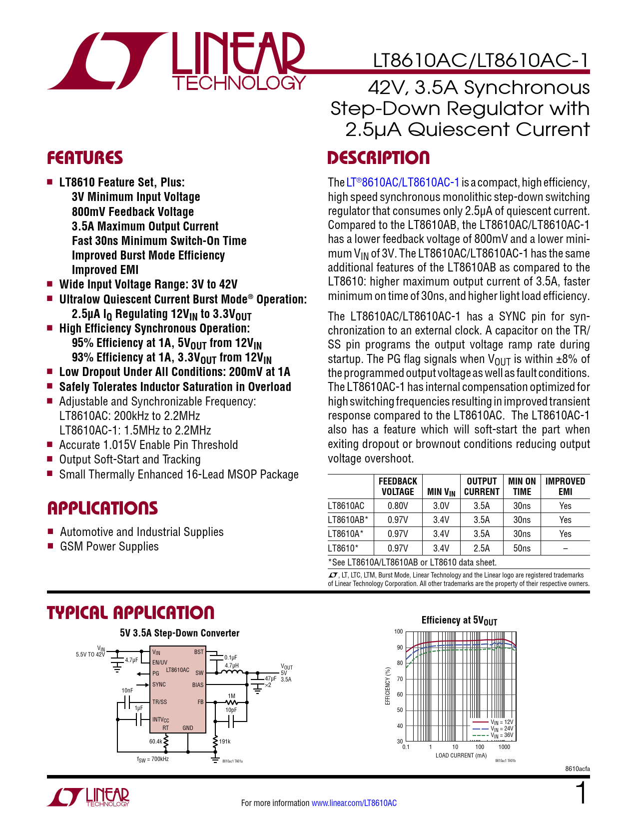 LT8610AC/LT8610AC-1 42V, 3.5A Synchronous Step-Down Regulator with 2.5µA Quiescent Current