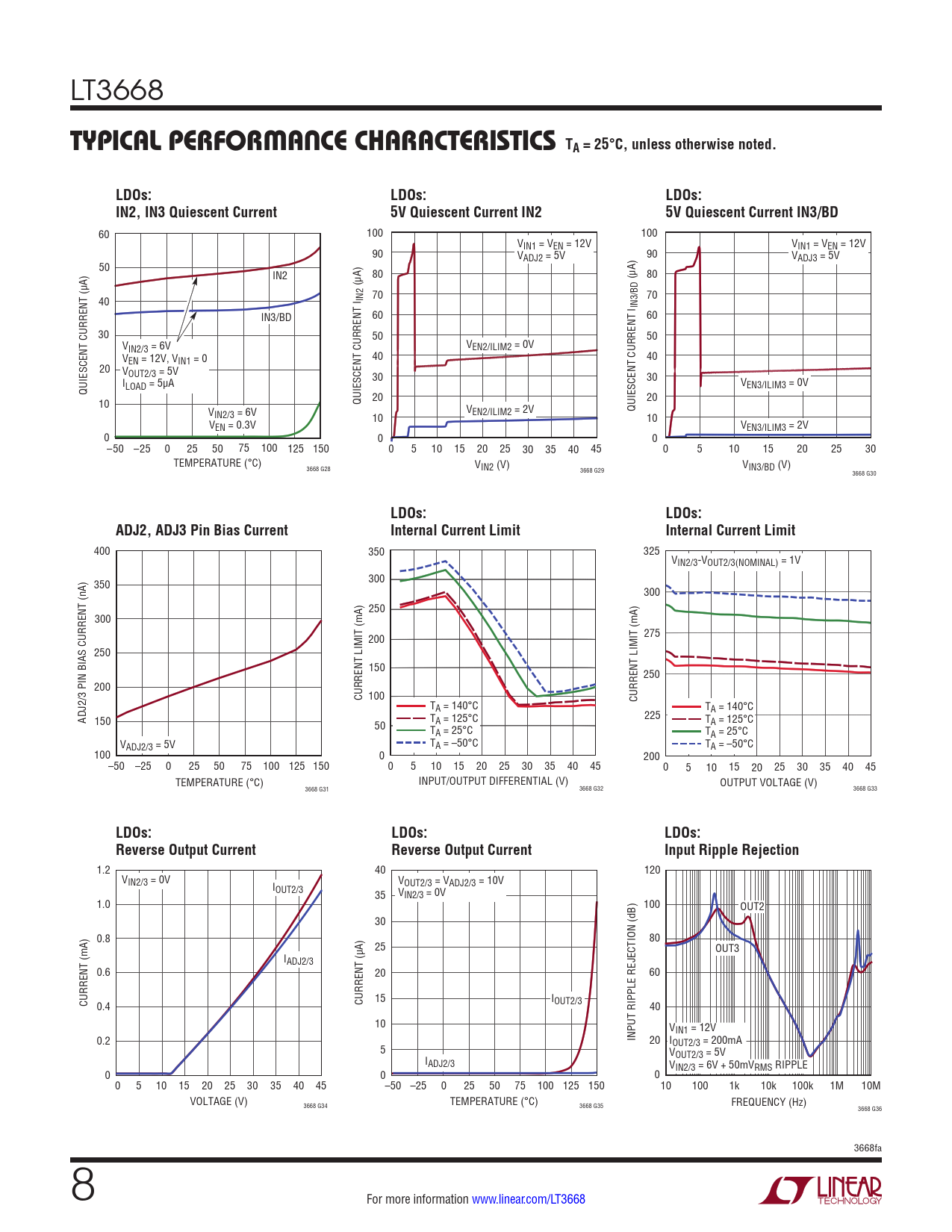 400 350 325 VIN2/3-VOUT2/3(NOMINAL) = 1V 350 300 300 250 300 200 275 250 150 250 200 CURRENT LIMIT (mA) 100 CURRENT LIMIT (mA) TA = 140°C TA = 140°C ADJ2/3 PIN BIAS CURRENT (nA) 150 T 225 50 A = 125°C TA = 125°C TA = 25°C TA = 25°C VADJ2/3 = 5V TA = –50°C TA = –50°C 100 0 200 –50 –25 0 25 50 75 100 125 150 0 5 10 15 20 25 30 35 40 45 0 5 10 15 20 25 30 35 40 45 TEMPERATURE (°C) INPUT/OUTPUT DIFFERENTIAL (V) OUTPUT VOLTAGE (V) 3668 G31 3668 G32 3668 G33