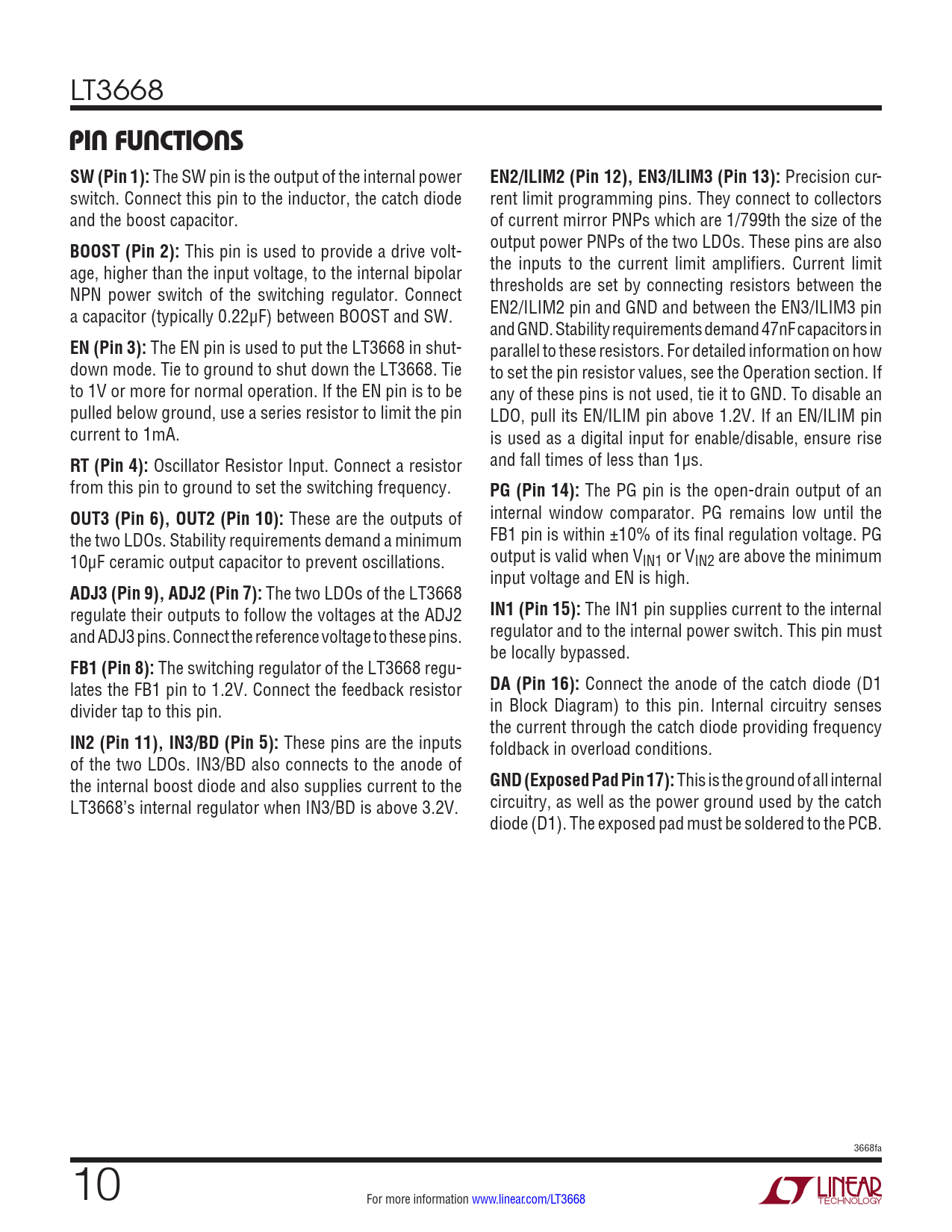 LT3668 PIN FUNCTIONSSW (Pin 1): The SW pin is the output of the internal power EN2/ILIM2 (Pin 12), EN3/ILIM3 (Pin 13): Precision cur- switch. Connect this pin to the inductor, the catch diode rent limit programming pins. They connect to collectors and the boost capacitor. of current mirror PNPs which are 1/799th the size of the BOOST (Pin 2): This pin is used to provide a drive volt- output power PNPs of the two LDOs. These pins are also age, higher than the input voltage, to the internal bipolar the inputs to the current limit amplifiers. Current limit NPN power switch of the switching regulator. Connect thresholds are set by connecting resistors between the a capacitor (typically 0.22μF) between BOOST and SW. EN2/ILIM2 pin and GND and between the EN3/ILIM3 pin and GND. Stability requirements demand 47nF capacitors in EN (Pin 3): The EN pin is used to put the LT3668 in shut- parallel to these resistors. For detailed information on how down mode. Tie to ground to shut down the LT3668. Tie to set the pin resistor values, see the Operation section. If to 1V or more for normal operation. If the EN pin is to be any of these pins is not used, tie it to GND. To disable an pulled below ground, use a series resistor to limit the pin LDO, pull its EN/ILIM pin above 1.2V. If an EN/ILIM pin current to 1mA. is used as a digital input for enable/disable, ensure rise RT (Pin 4): Oscillator Resistor Input. Connect a resistor and fall times of less than 1µs. from this pin to ground to set the switching frequency. PG (Pin 14): The PG pin is the open-drain output of an OUT3 (Pin 6), OUT2 (Pin 10): These are the outputs of internal window comparator. PG remains low until the the two LDOs. Stability requirements demand a minimum FB1 pin is within ±10% of its final regulation voltage. PG 10μF ceramic output capacitor to prevent oscillations. output is valid when VIN1 or VIN2 are above the minimum input voltage and EN is high. ADJ3 (Pin 9), ADJ2 (Pin 7): The two LDOs of the LT3668 regulate their outputs to follow the voltages at the ADJ2 IN1 (Pin 15): The IN1 pin supplies current to the internal and ADJ3 pins. Connect the reference voltage to these pins. regulator and to the internal power switch. This pin must be locally bypassed. FB1 (Pin 8): The switching regulator of the LT3668 regu- lates the FB1 pin to 1.2V. Connect the feedback resistor DA (Pin 16): Connect the anode of the catch diode (D1 divider tap to this pin. in Block Diagram) to this pin. Internal circuitry senses the current through the catch diode providing frequency IN2 (Pin 11), IN3/BD (Pin 5): These pins are the inputs foldback in overload conditions. of the two LDOs. IN3/BD also connects to the anode of the internal boost diode and also supplies current to the GND (Exposed Pad Pin 17): This is the ground of all internal LT3668’s internal regulator when IN3/BD is above 3.2V. circuitry, as well as the power ground used by the catch diode (D1). The exposed pad must be soldered to the PCB. 3668fa 10 For more information www.linear.com/LT3668 Document Outline Features Applications Description Typical Application Typical Performance Characteristics Pin Functions Block Diagram Operation Applications Information Typical Application Related Parts
