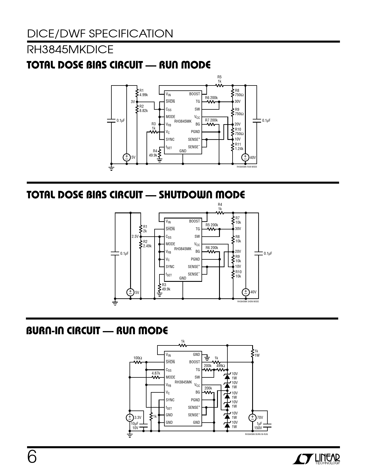 1k 1k VIN GND 1W 100Ω 1k SHDN BOOST 200k 499Ω CSS TG 4.87k 10V MODE SW 1W RH3845MK V 10V FB VCC 200k 1W VC BG 10V 1W SYNC PGND 10V f 1W SET SENSE+ + 10V 1k GND SENSE– – 3.3V 1W +– 70V 10µF GND GND 10V 1µF 10V 1W 150V RH3845MK BURN IN-RUN 6 Document Outline Description Typical Application Description absolute Maximum Ratings Dice Pinout Table 1: Dice/DWF Electrical Test Limits Table 2: Electrical Characteristics Table 3: Electrical Characteristics Table 4: Electrical Test Requirements Total Dose Bias Circuit — Run Mode Total Dose Bias Circuit — Shutdown Mode Burn-in Circuit — run mode Typical Performance characteristics DESCRIPTION ABSOLUTE MAXIMUM RATINGS TABLE 1 Dice/DWF Electrical Test Limits TABLE 2 Electrical Characteristics TABLE 3 Electrical Characteristics Table 5. Electrical Test Requirements Total Dose Bias Circuit Burn-In Circuit Typical Performance Characteristics preirradiation Typical Performance Characteristics Post-irradiation Revision History