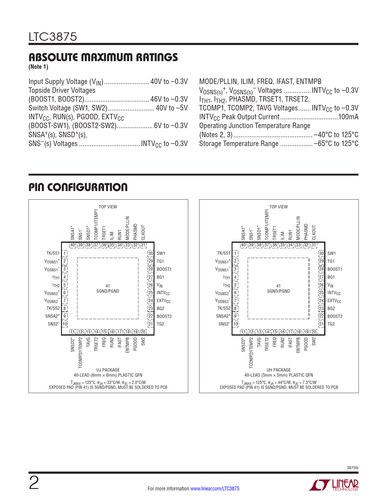 Input Supply Voltage (VIN) ... 40V to –0.3V MODE/PLLIN, ILIM, FREQ, IFAST, ENTMPB Topside Driver Voltages V + – OSNS(s) , VOSNS(s) Voltages ... INTVCC to –0.3V (BOOST1, BOOST2).. 46V to –0.3V ITH1, ITH2, PHASMD, TRSET1, TRSET2, Switch Voltage (SW1, SW2) .. 40V to –5V TCOMP1, TCOMP2, TAVG Voltages ...INTVCC to –0.3V INTVCC, RUN(s), PGOOD, EXTVCC INTVCC Peak Output Current ..100mA (BOOST-SW1), (BOOST2-SW2).. 6V to –0.3V Operating Junction Temperature Range SNSA+(s), SNSD+(s), (Notes 2, 3) .. –40°C to 125°C SNS–(s) Voltages ..INTVCC to –0.3V Storage Temperature Range .. –65°C to 125°C